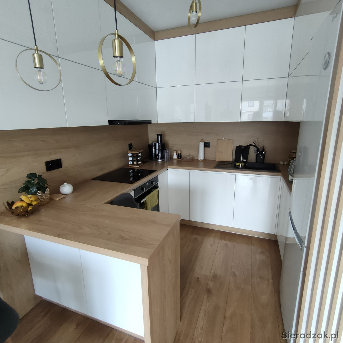 Salon z otwartą kuchnią, z całym sprzętem AGD: duża lodówka z zamrażalką, piekarnik, zmywarka, płyta indukcyjna