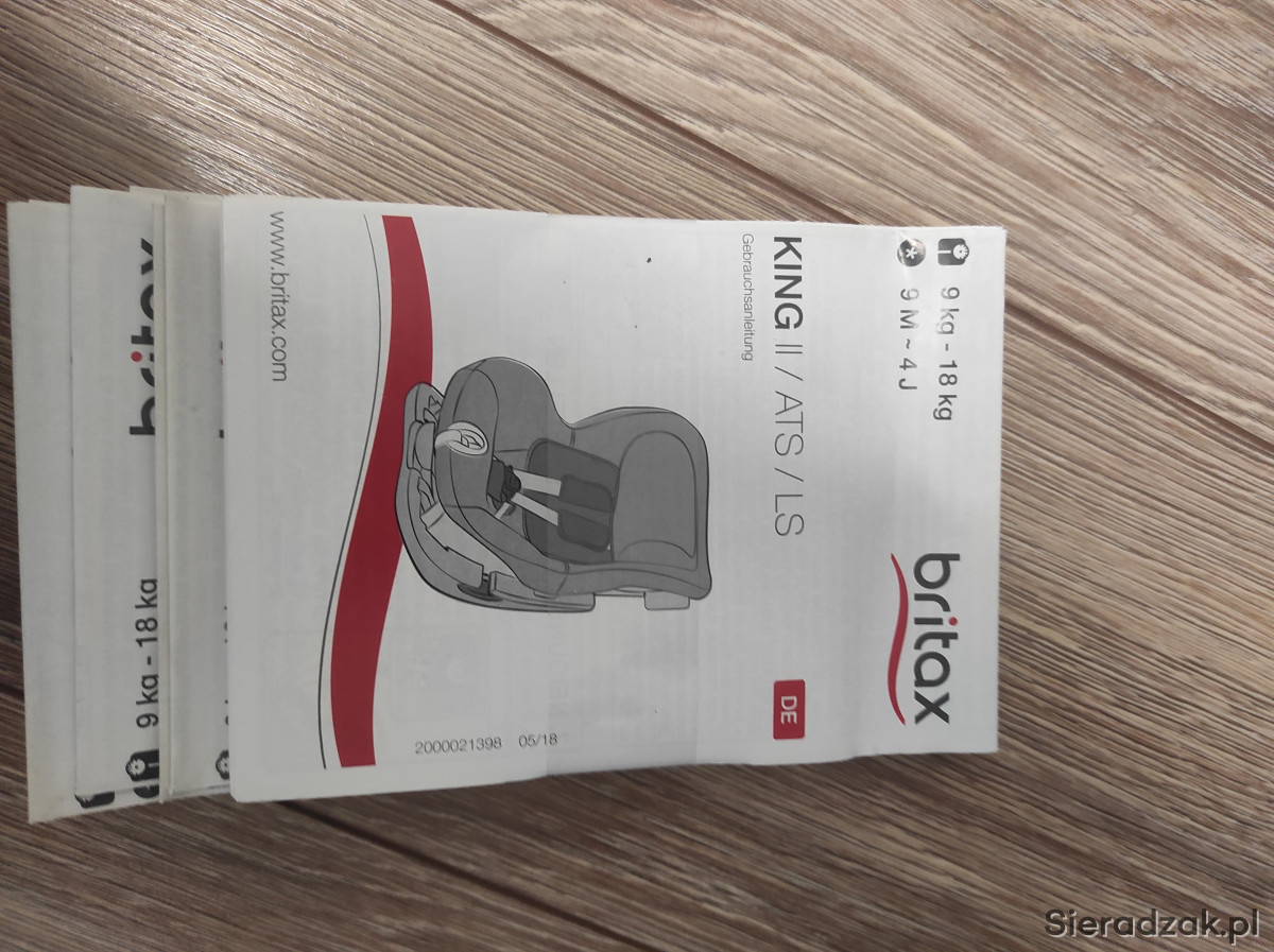 Sprzedam fotelik samochodowy Britax Romer King II. Fotelik bezwypadkowy po jednym dziecku. Zakres wagi 9 - 18 kg. Stan fotelika jak na zdjęciu. Odbiór osobisty do uzgodnienia Chojne / Sieradz