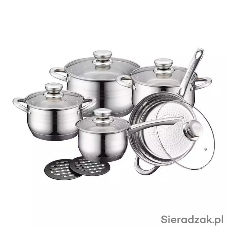 Zestaw garnków wysokiej klasy wykonanych ze stali chromowo-niklowej (18/10) z kapsułowym dnem. Grubość dna to 18mm. Stal, z której wykonano naczynia charakteryzuje się tzw. niskim poziomem porowości, dzięki czemu naczynia są łatwe do utrzymania w warunkach higienicznych w gospodarstwach domowych. Stal jest bardzo wysokiej jakości i w porównaniu do naczyń np. z aluminium w wyższej temperaturze nie powoduje dużej migracji cząsteczek do pożywienia.