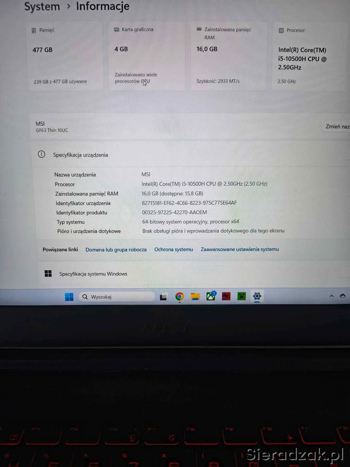 Witam na sprzedaż laptop gamingowy MSI totalnie wyczyszczony, pasta termo, wgrane najnowsze sterowniki oraz Windows 11.
