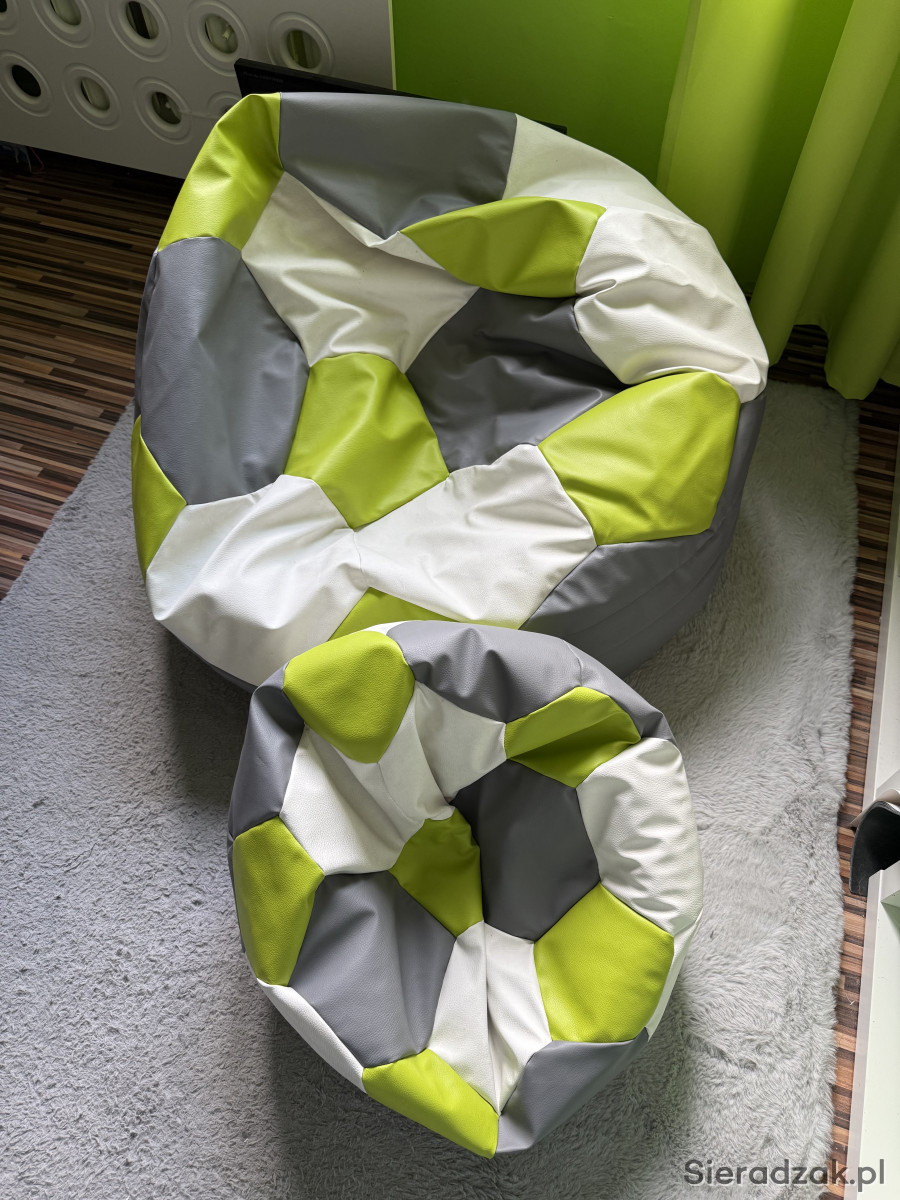 Sprzedam piłki pufy- fotele. Kolor szaro -zielono-biały. Jedna duża xxxl druga mniejsza zł. Cena 90 zł za dwie sztuki. Tel. 502576389