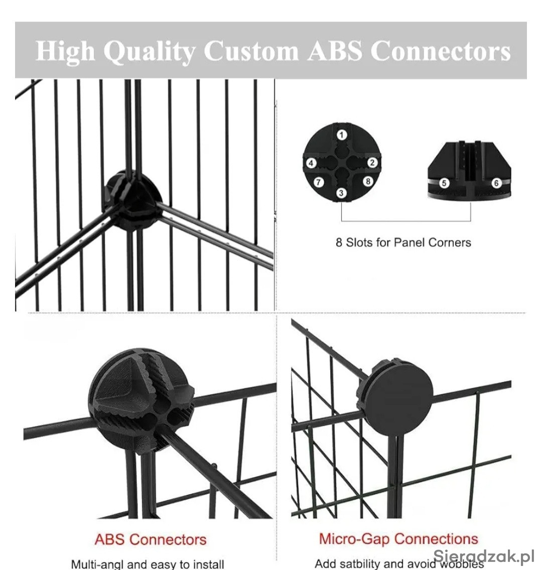 - Łatwy montaż – dzięki niestandardowym przyłączom ABS można łatwo zbudować siatkę drucianą w różnych kształtach i wysokościach. Dołączona taśma nylonowa sprawia, że ogrodzenie jest jeszcze bardziej stabilne. Oprócz kojca dla zwierząt domowych można również zmontować regały do przechowywania.