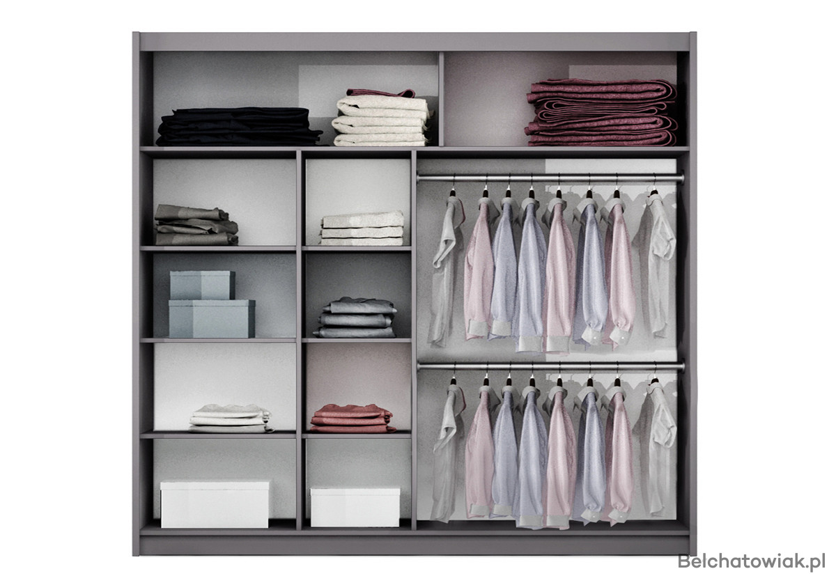 Wyposażenie: aluminiowe prowadnice, dolne wózki na łożyskach, 2 drążki na ubrania, pakowne półki