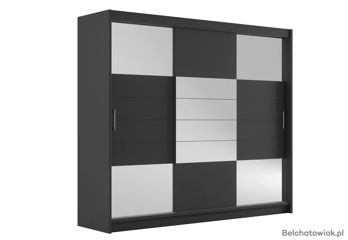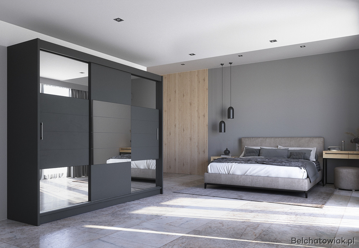 Nowoczesna szafa przesuwna grafitowa z lustrem to połączenie elegancji i praktyczności. Dzięki frontowi z lustrem w odcieniu grafitowym, szafa powiększa optycznie przestrzeń i nadaje wnętrzu wyjątkowego charakteru. Doskonale sprawdzi się jako szafa do sypialni, garderoby lub przedpokoju.