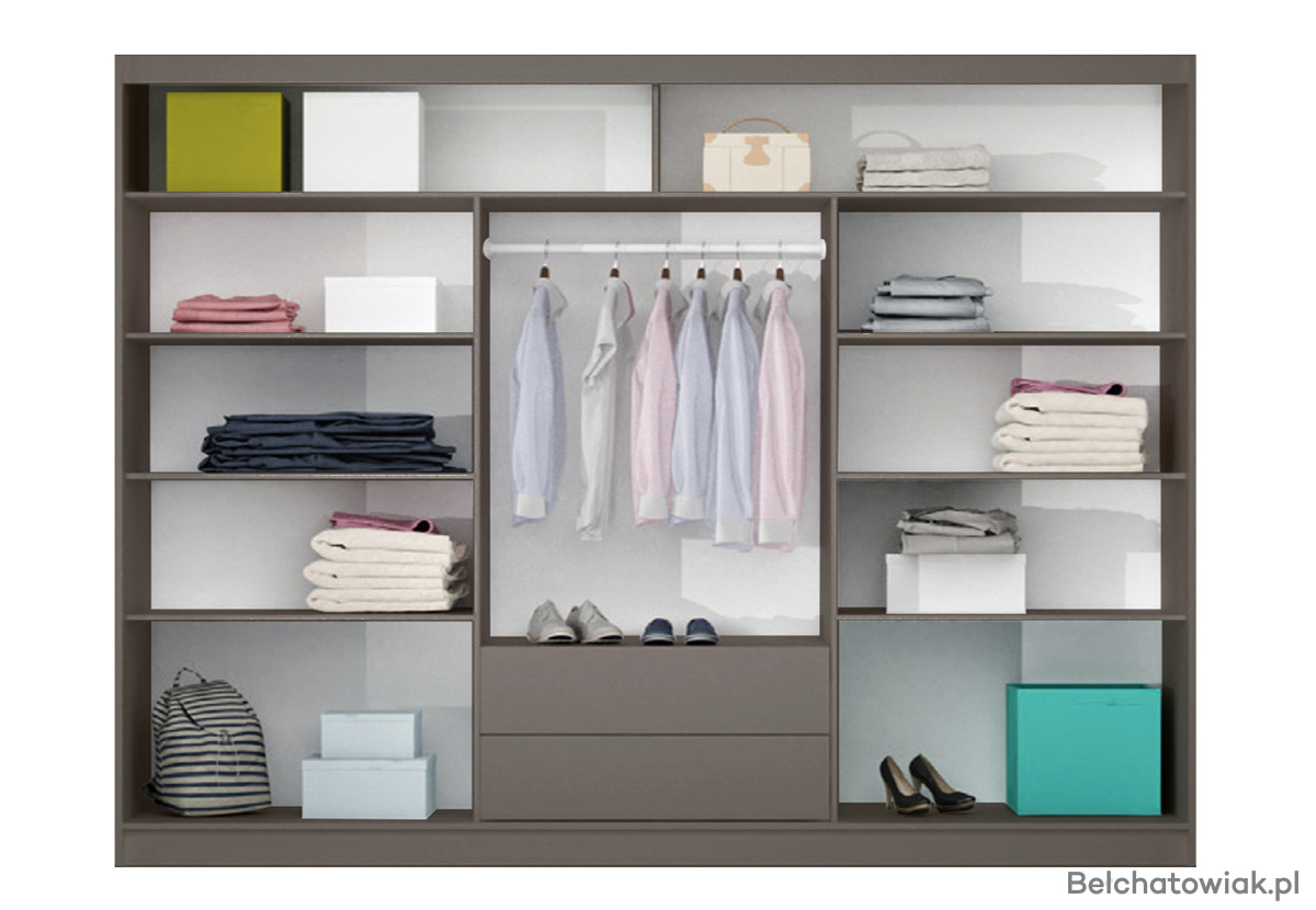 Wyposażenie: aluminiowe prowadnice, dolne wózki na łożyskach, 1 drążek na ubrania, półki oraz 2 pojemne szuflady