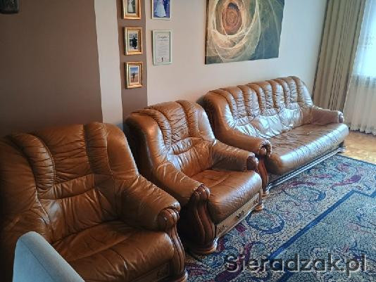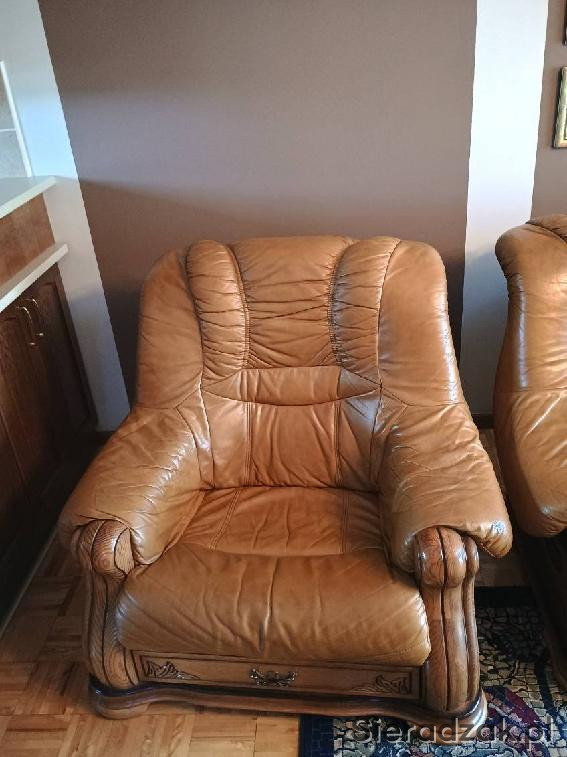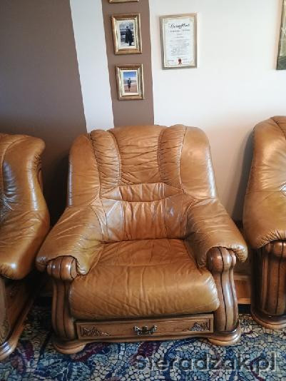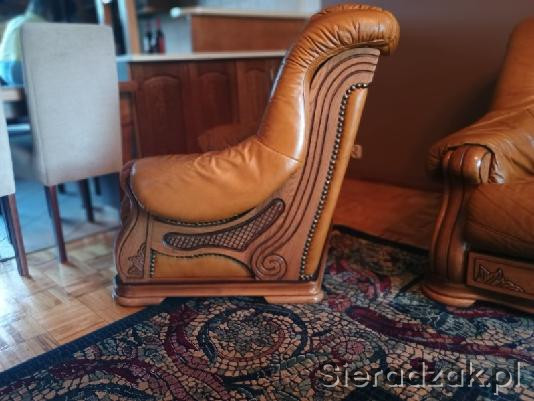 Na sprzedaż wystawiam meble skórzane wykończone drewnem dębowym rzeźbionym. Komplet składa się kanapy dwóch foteli oraz ławy. Stan dobry , normalne ślady użytkowania :) Polecam serdecznie