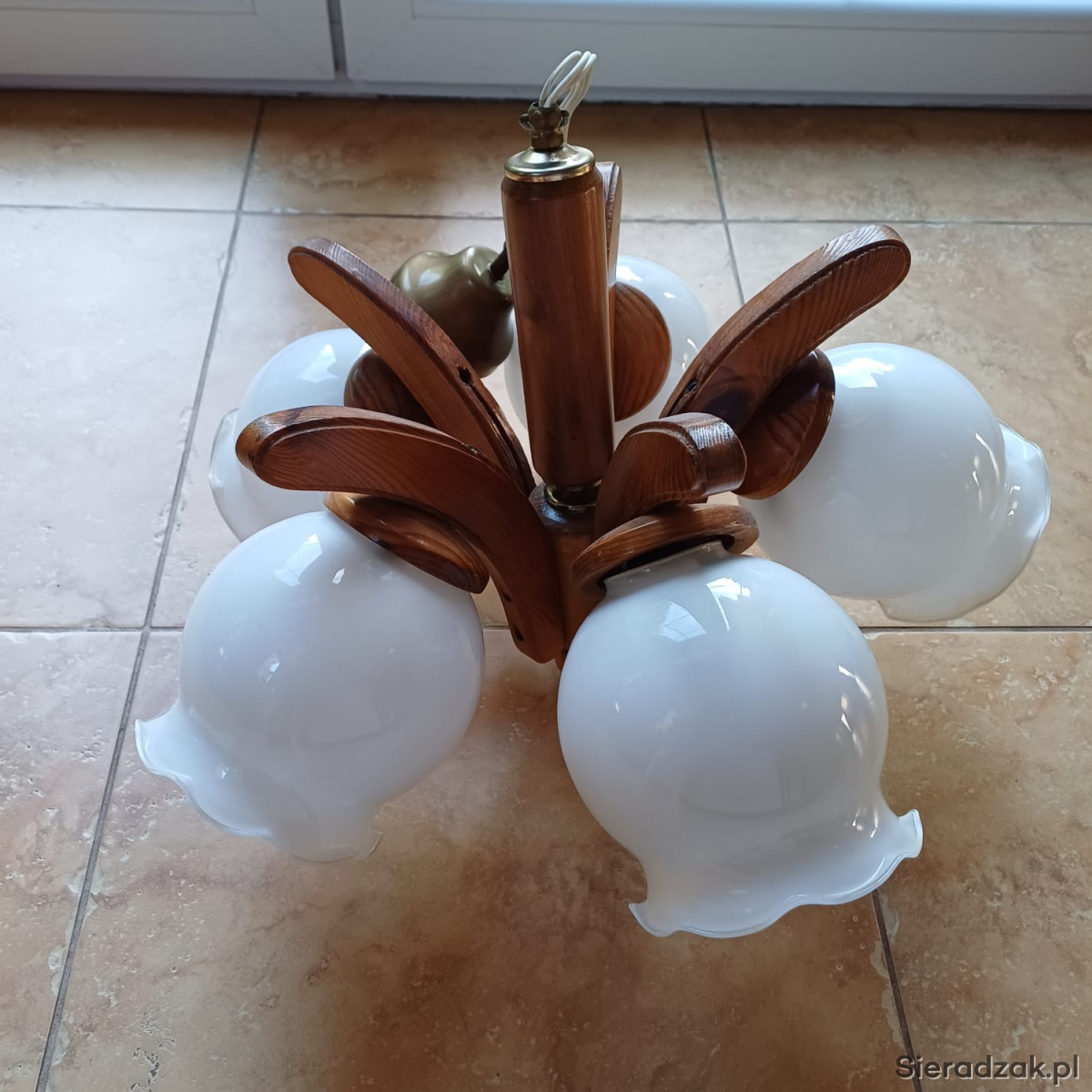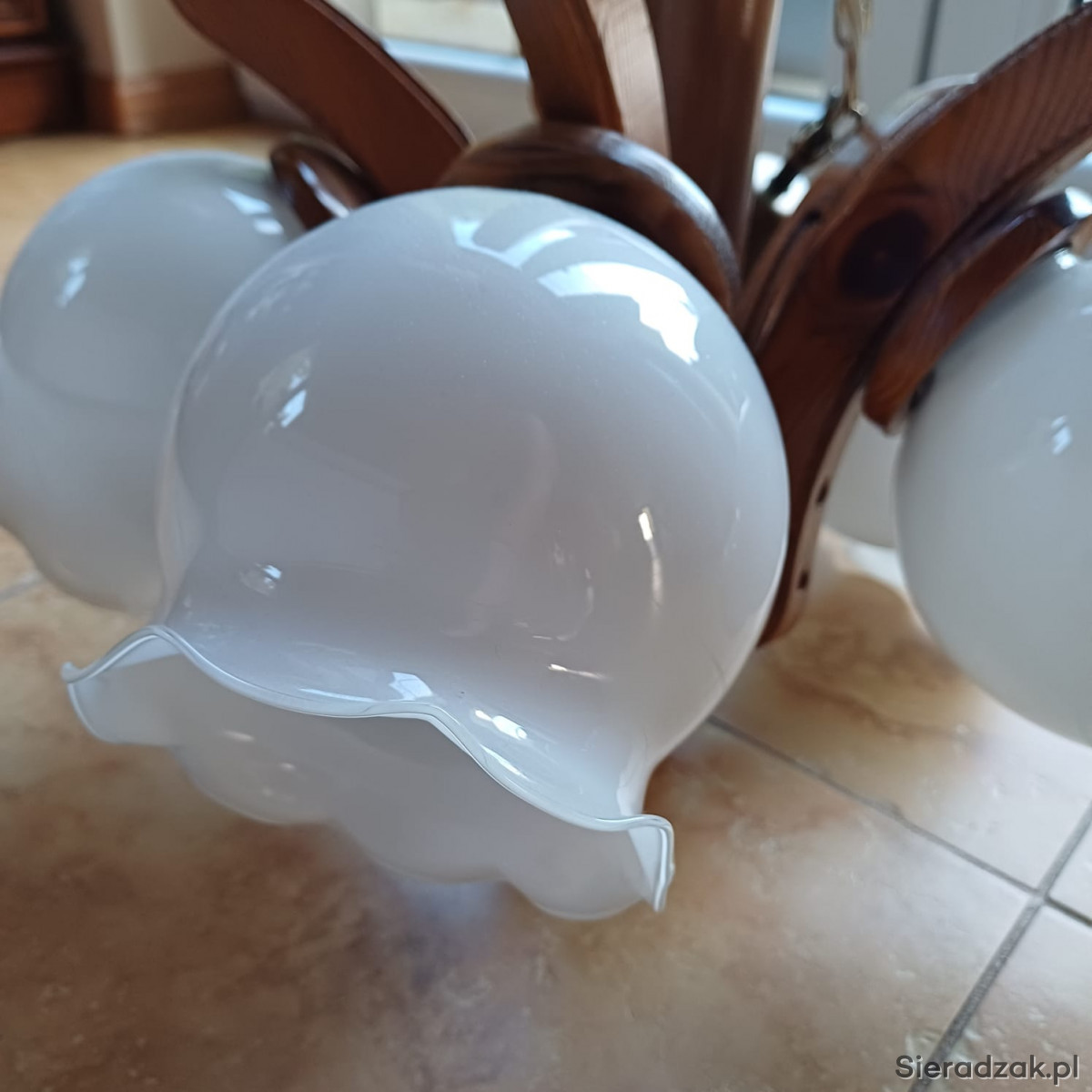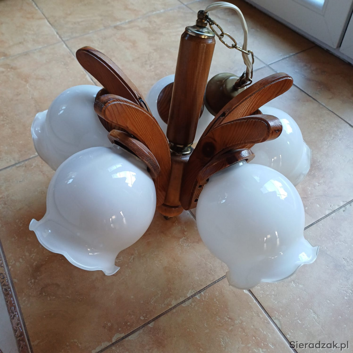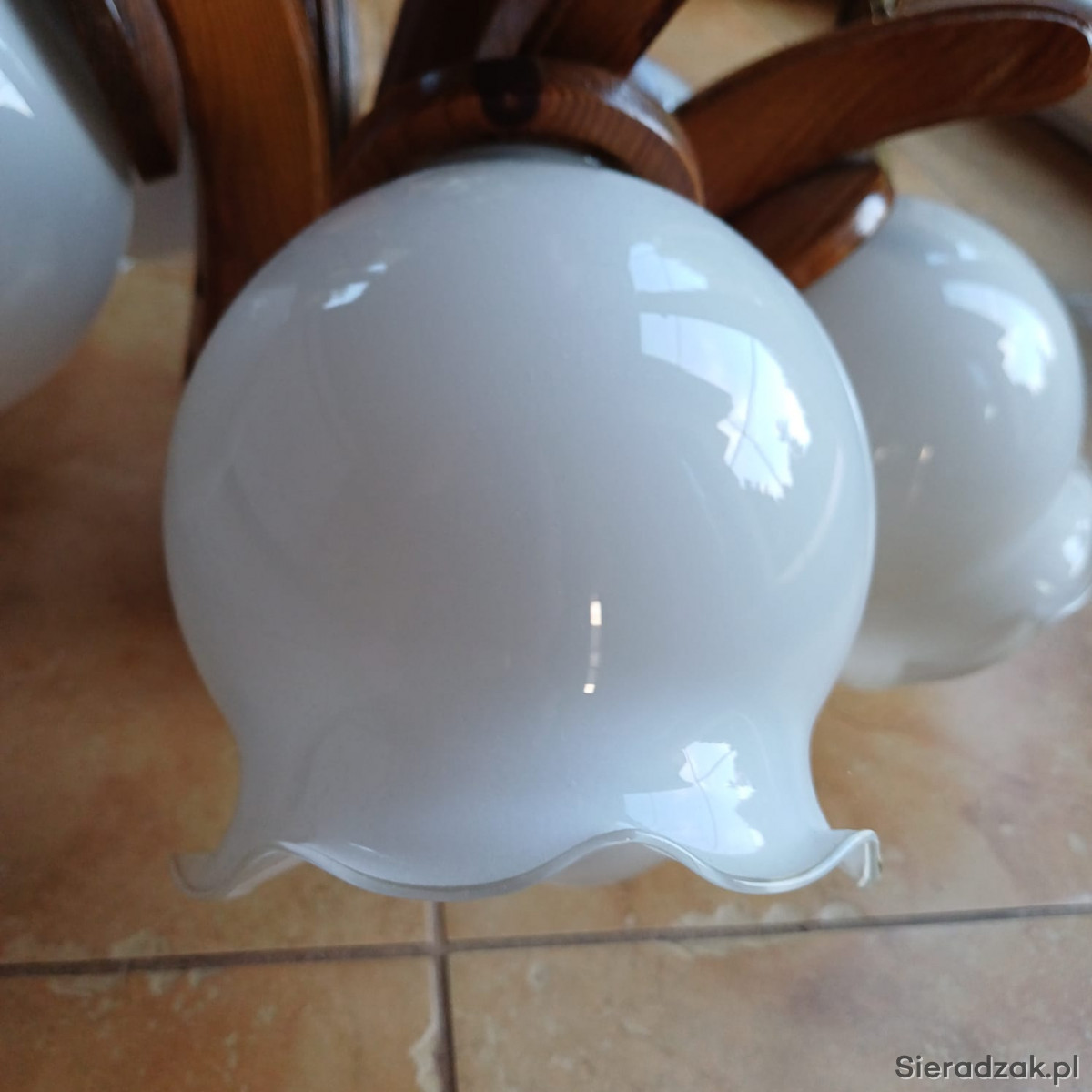 Żyrandol drewniany pięcioramienny z białymi szklanymi kloszami.