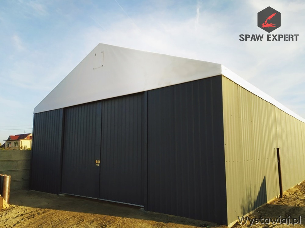 Konstrukcja stalowa jest zabezpieczona antykorozyjnie przez proces cynkowania ogniowego. Materiał dachowy to plandeka o gramaturze 680gr/m2, natomiast boki to blacha trapezowa T 18.