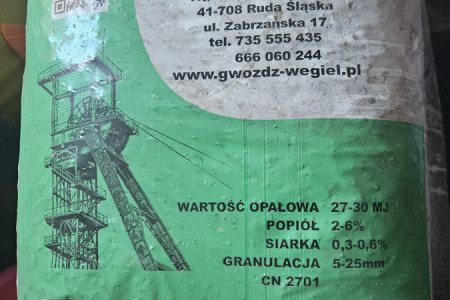 Sprzedam węgiel EKOGROSZEK firmy Gwóźdź. Ilość to 2 tony pakowane po 25 kg. Wartości kalorycznej 27-30 MJ. Worki na palcie.