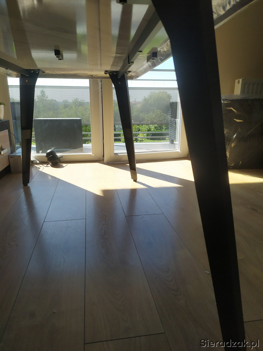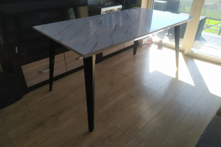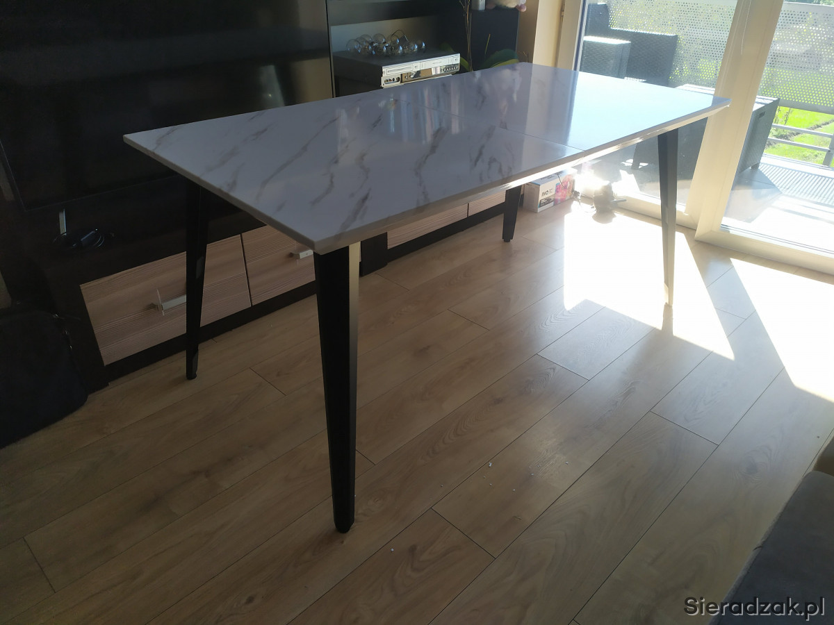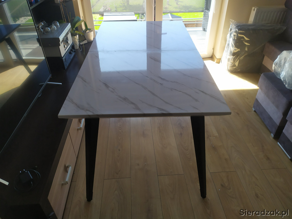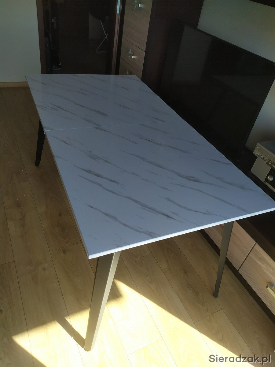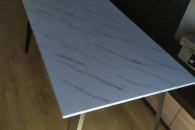 Prostokątny stół wykonany jest z wytrzymałej laminowanej płyty w kolorze białego marmuru z odpornymi na zużycie metalowymi nogami. Metalowa belka krzyżowa na dole stołu jest solidna i dobrze zbalansowana.