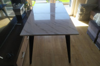 Stół vintage w kolorze blatu białego marmuru z czarnymi metalowymi nóżkami.
