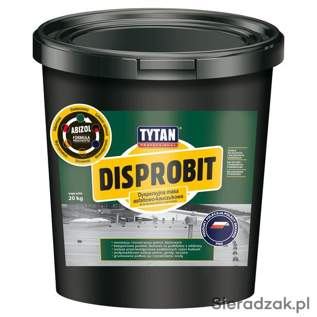 TYTAN PROFESSIONAL Disprobit Dyspersyjna masa asfaltowo-kauczukowa do konserwacji dachów i hydroizolacji to masa asfaltowa modyfikowana kauczukiem syntetycznym, która przeznaczona jest do renowacji i konserwacji pokryć dachowych. Nadaje się też do wykonywania poziomych i pionowych powłok przeciwwilgociowych. Dyspersyjna masa asfaltowo-kauczukowa TYTAN cechuje się przydatnością zarówno na suchych, jak i wilgotnych podłożach. Dodatkowo nawet przy wysokich temperaturach nie spływa z pionowych powierzchni. Nie zawiera rozpuszczalników, a tym samym nie uszkadza styropianu. Co więcej, masa bitumowa jest elastyczna i wydajna – przy gruntowaniu należy rozcieńczyć wodą w stosunku 1:2. Jej ważność wynosi aż 12 miesięcy od daty produkcji. Masa asfaltowo-kauczukowa z serii TYTAN PROFESSIONAL posiada bogaty zakres zastosowań. Idealnie sprawdza się podczas generalnego remontu bądź budowy domu. Poza renowacją pokryć dachowych, służy też do tworzenia różnorodnych powłok przeciwwilgociowych. Przykładowo umożliwia wykonanie izolacji fundamentów (izolacje przeciwwodne ław i ścian fundamentowych), jak i izolacji podposadzkowych (garaży, piwnic, balkonów bądź tarasów). Ponadto masa dyspersyjna TYTAN pozwala na przygotowywanie bezspoinowych powłok dachowych na podkładzie z papy, włókniny, tkaniny technicznej i tym podobne.