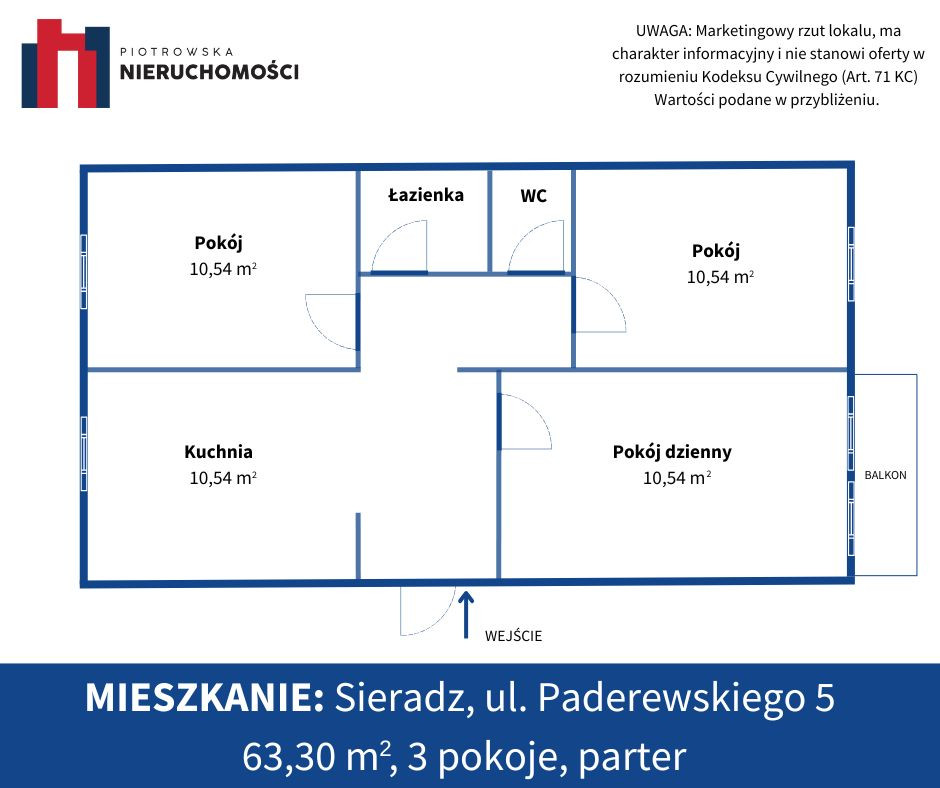 Na sprzedaż – funkcjonalne mieszkanie 3-pokojowe o powierzchni 63,30 m² położone na parterze w bloku przy ul. Paderewskiego 5 w Sieradzu.