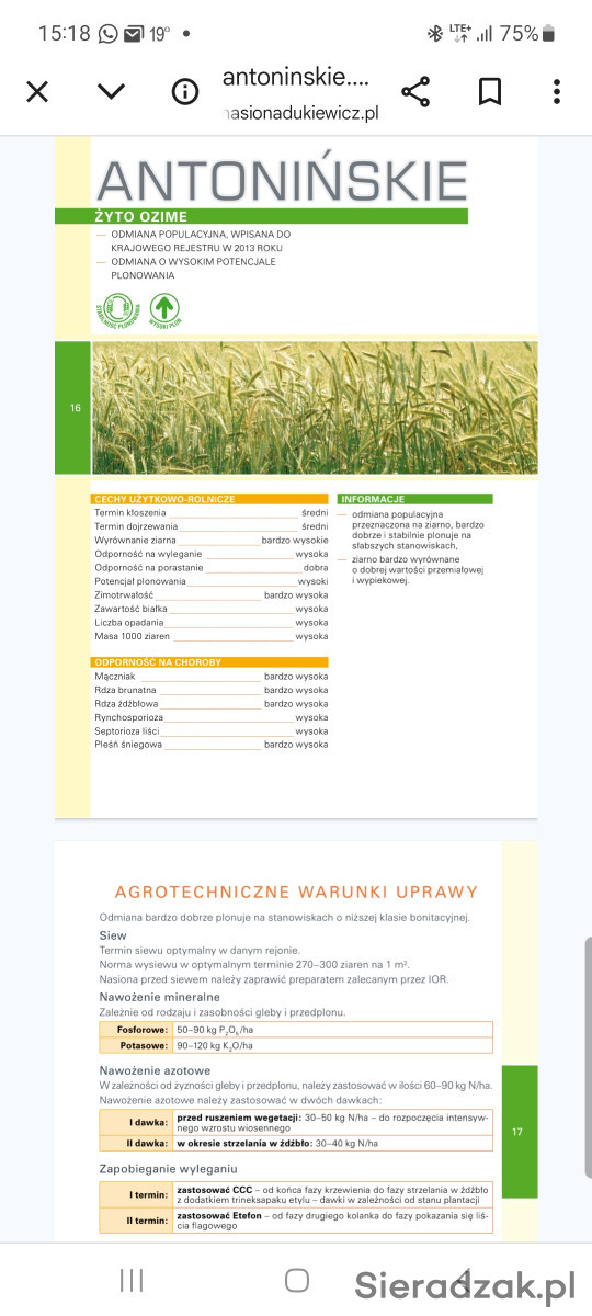 Sprzedam żyto ANTONIŃSKIE ozime drugi rok po centrali. Tel 504128514
