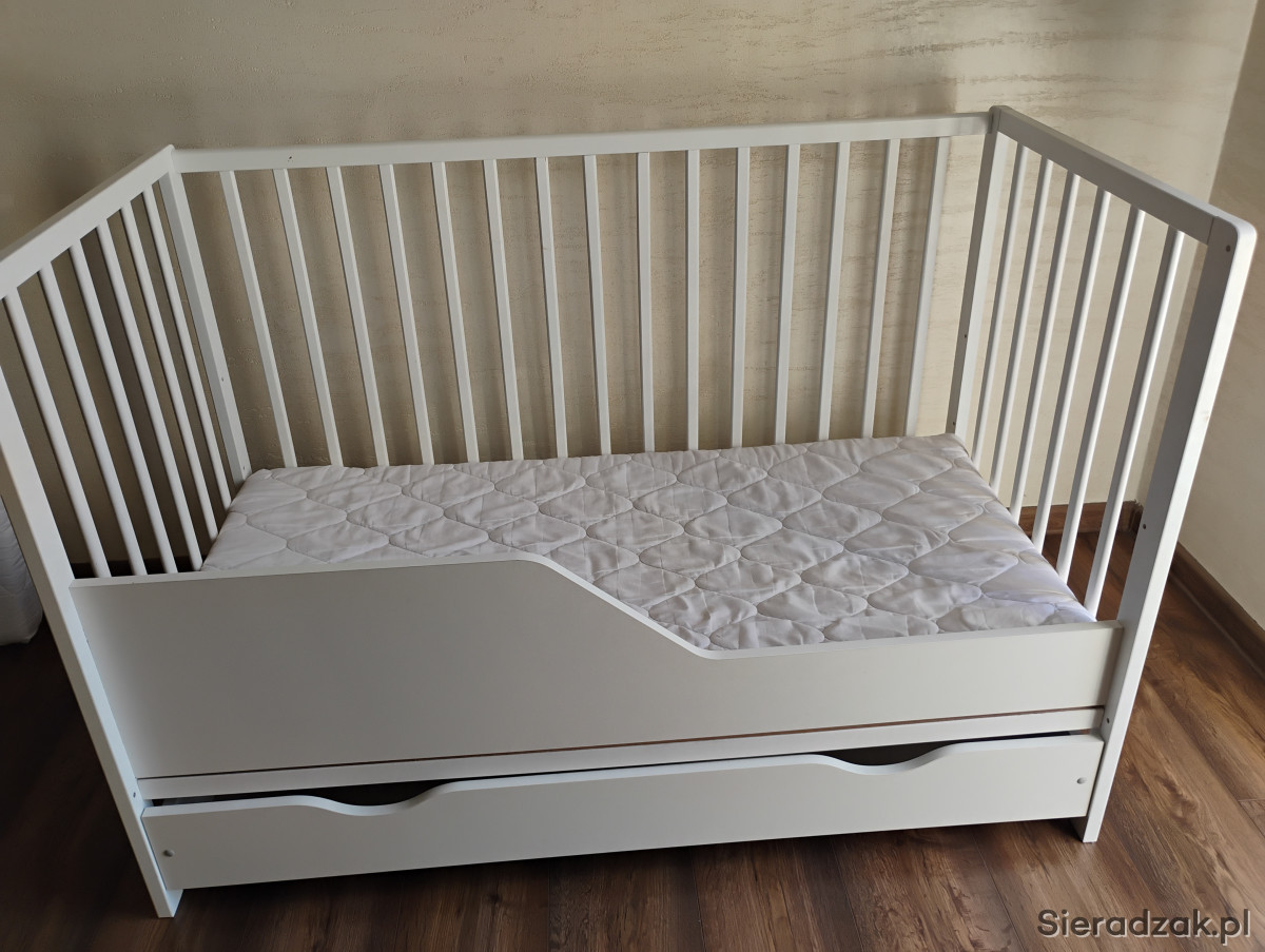 Łóżeczko od urodzenia, możliwość montażu na trzech poziomach dna łóżeczka, szuflada na prowadnicach, wyjmowane 3 szczebelki. Materac jak ktoś by chciał dorzucam w gratisie. Używane przez jedno dziecko. Dzięki barierce widocznej na zdjęciu slozylo do 3 roku życia. Widoczne lekkie ślady użytkowania