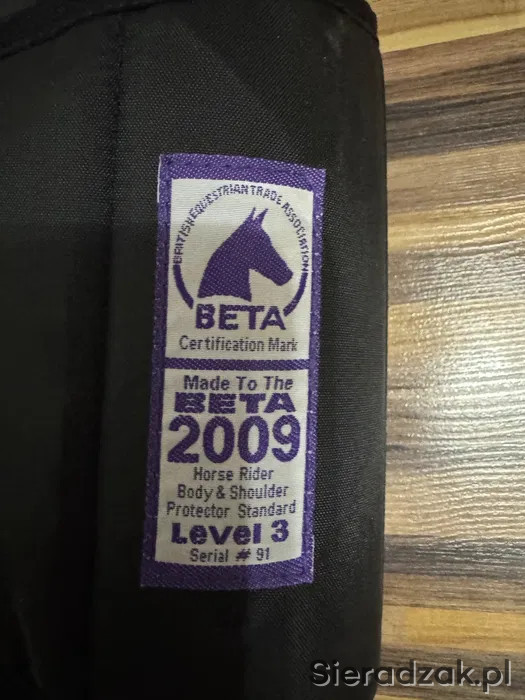 Kamizelka posiada certyfikat BETA 2009 - Level 3, co oznacza najwyższy poziom ochrony zatwierdzony do użytkowania w jeździectwie sportowym i rekreacyjnym.