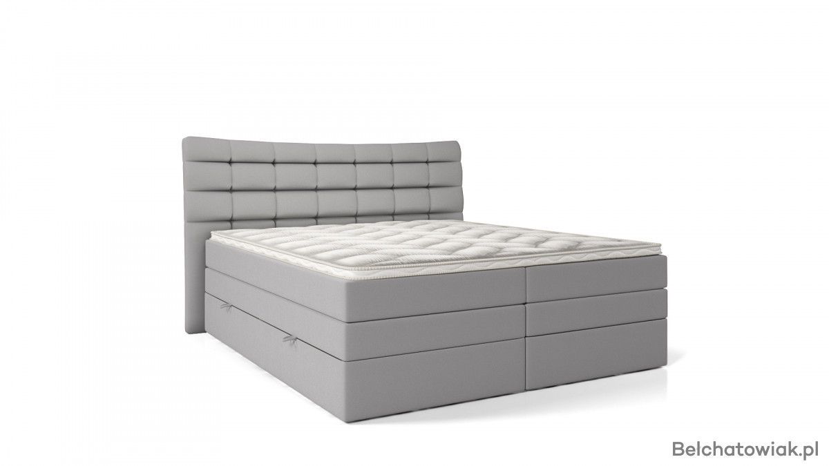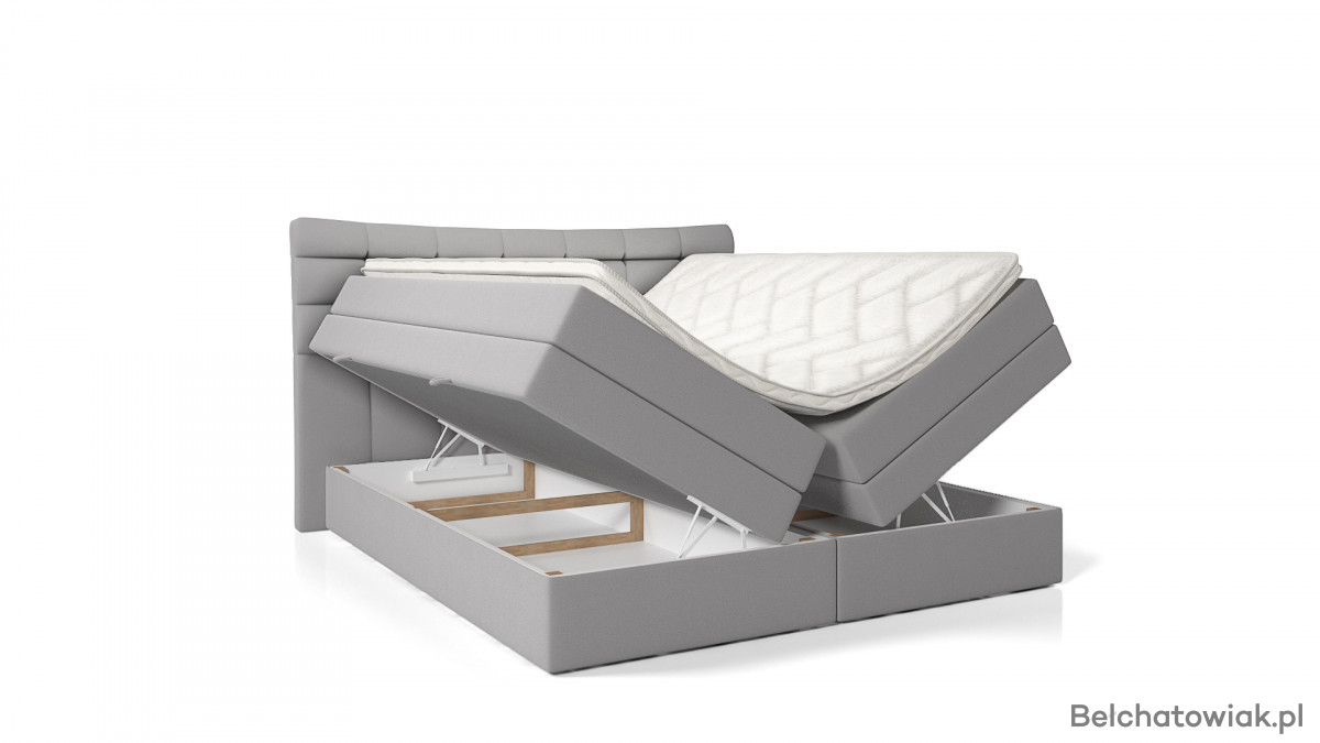 Łóżko wyposażono w dwa obszerne pojemniki na pościel, które pozwalają na przechowywanie kołder, poduszek oraz innych akcesoriów sypialnianych. Łatwy dostęp z obu stron sprawia, że codzienne użytkowanie jest wygodne i funkcjonalne.