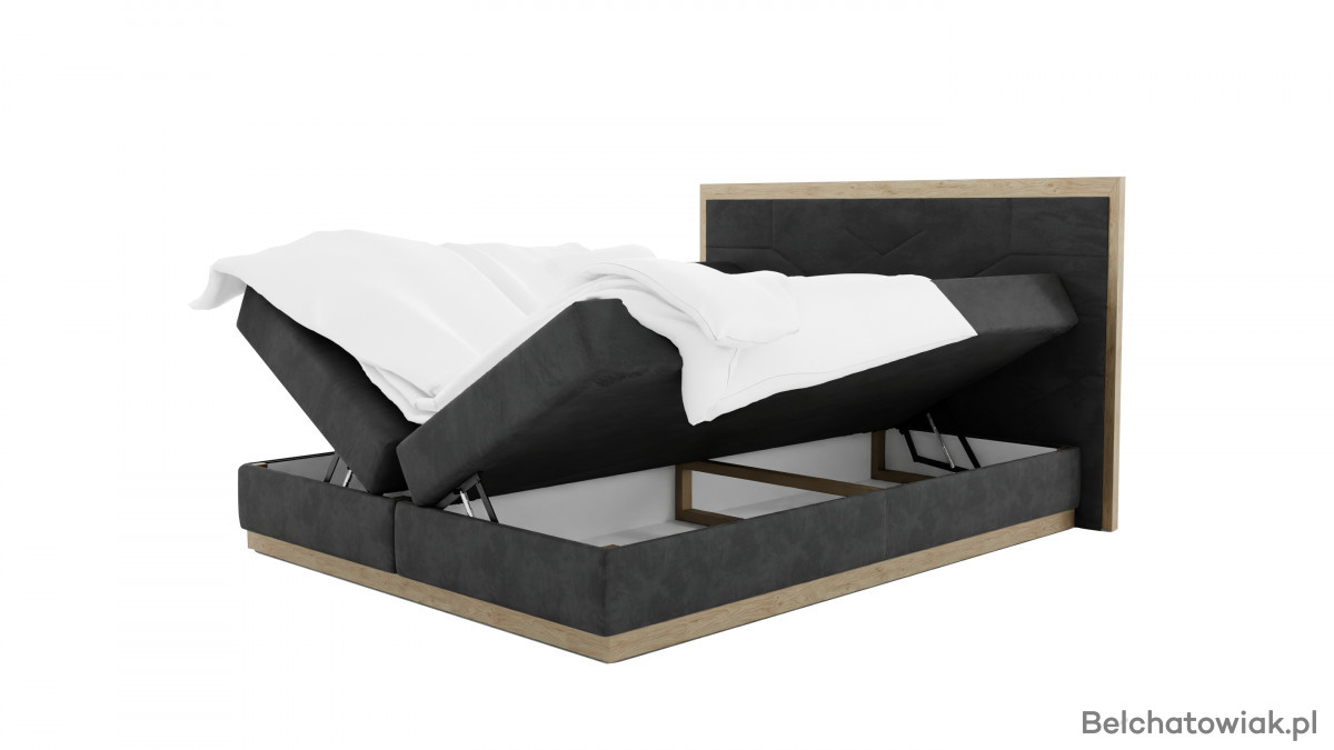 Łóżko posiada dwa pojemniki na pościel, które ułatwiają utrzymanie porządku w sypialni. To idealne miejsce na kołdry, poduszki czy dodatkowe tekstylia.