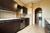 ► Ustawna kuchnia wyposażona w meble oraz sprzęty AGD. Na podłodze kafle, na ścianach glazura i boazeria.