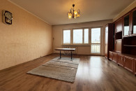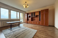 ► Duży salon z wyjściem na balkon typu loggia. Na podłogach panele, na ścianach tapety.