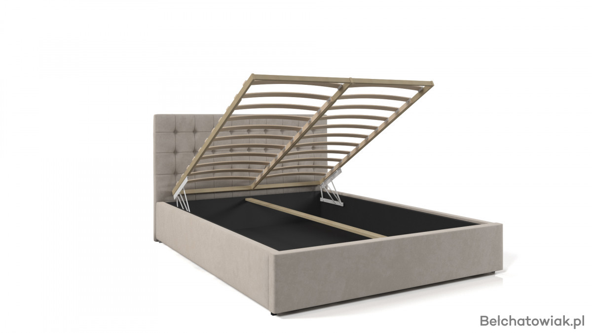 Model został wyposażony w obszerny pojemnik na pościel, otwierany od przodu.