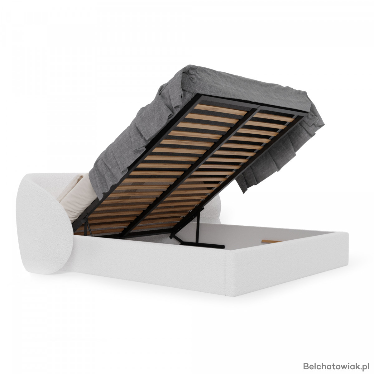 Wyjątkowy zagłówek o ekstrawaganckim charakterze podkreśla indywidualność wnętrza, a solidna konstrukcja z wbudowanym stalowym stelażem i praktycznym pojemnikiem na pościel sprawia, że łóżko jest nie tylko piękne, ale i wygodne w codziennym użytkowaniu