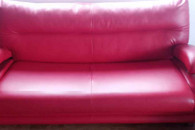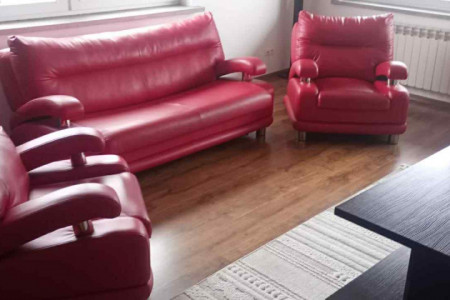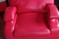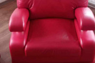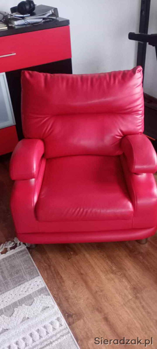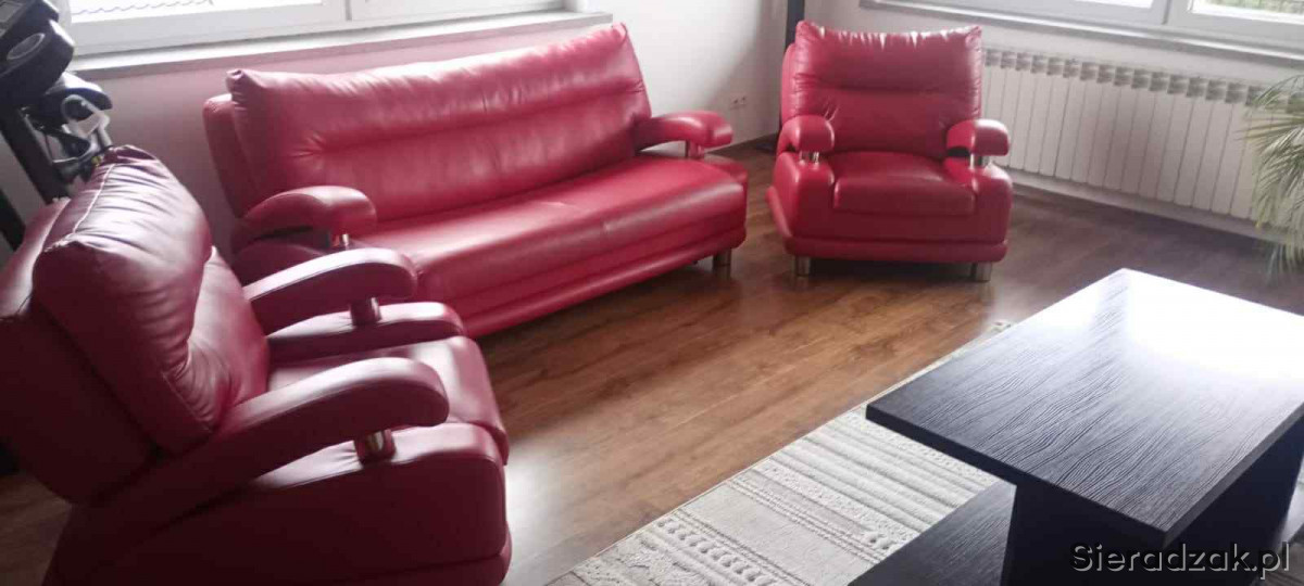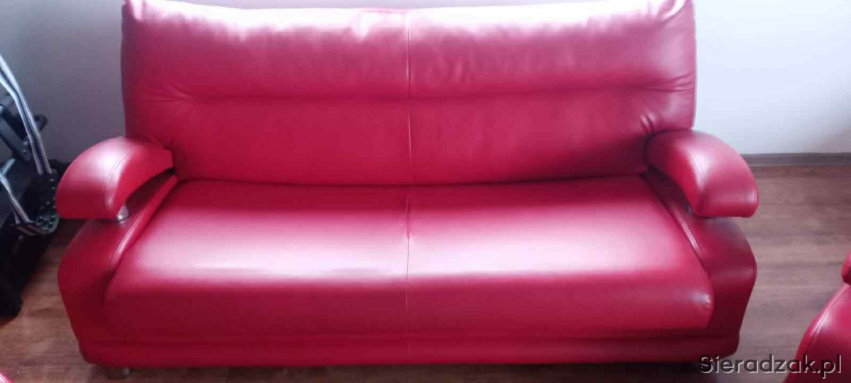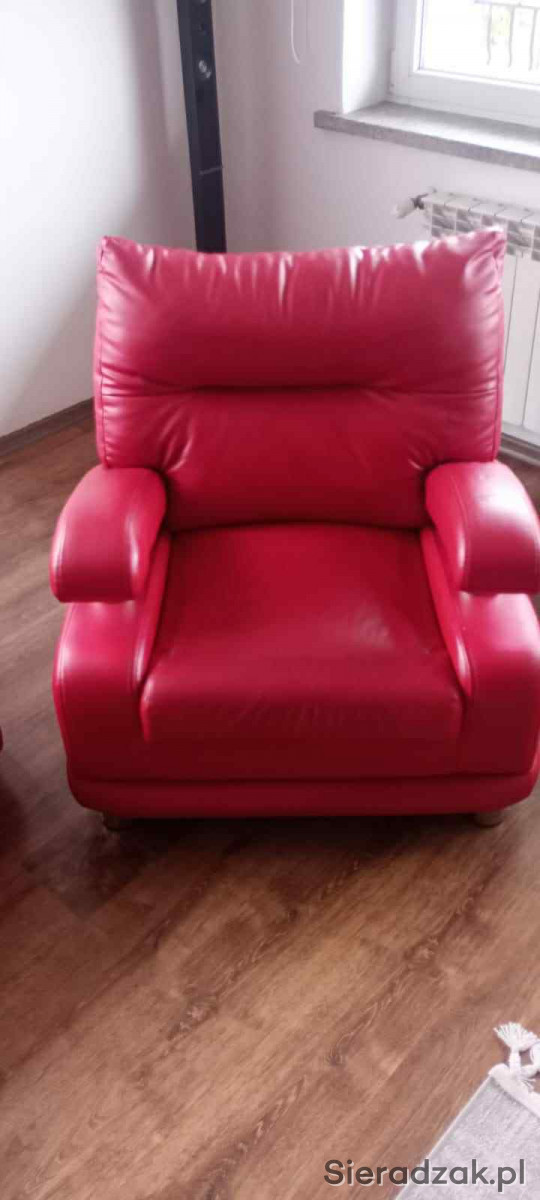 Sprzedam komplet: kanapa i dwa fotele z czerwonej skóry z srebrnymi elementami.