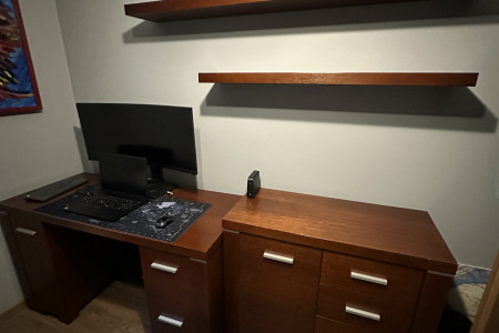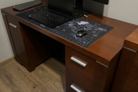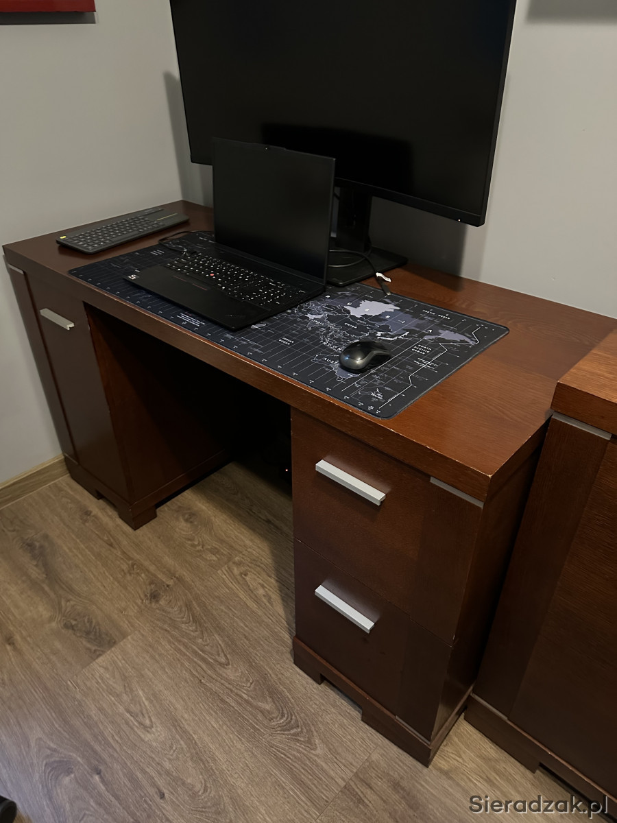 biurko o wymiarach 135x57 cm posiada dwie głębokie szuflady po prawej stronie oraz dwie półki na dokumenty zamykane drzwiczkami po lewej stronie.