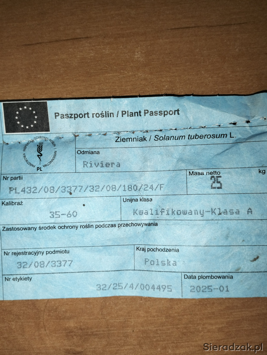 Sprzedam ziemniaki Riviera kal 3-5,5cm  świeże wysadzone z kwalifiaktu klasy A