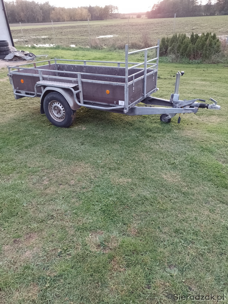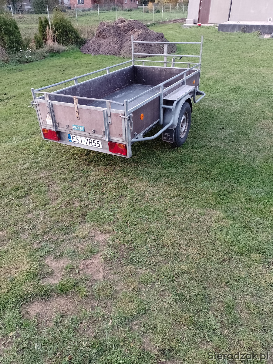 Witam sprzedam przyczepkę samochodowa z hamulcem najazdowym marki Hapert DMC 1350kg, ładowność 1060kg, sprowadzona z Holandii, stan techniczny bardzo dobry, nowe opony typu C, nowa podłoga, wymiary skrzyni ładunkowej 130cm/252cm
