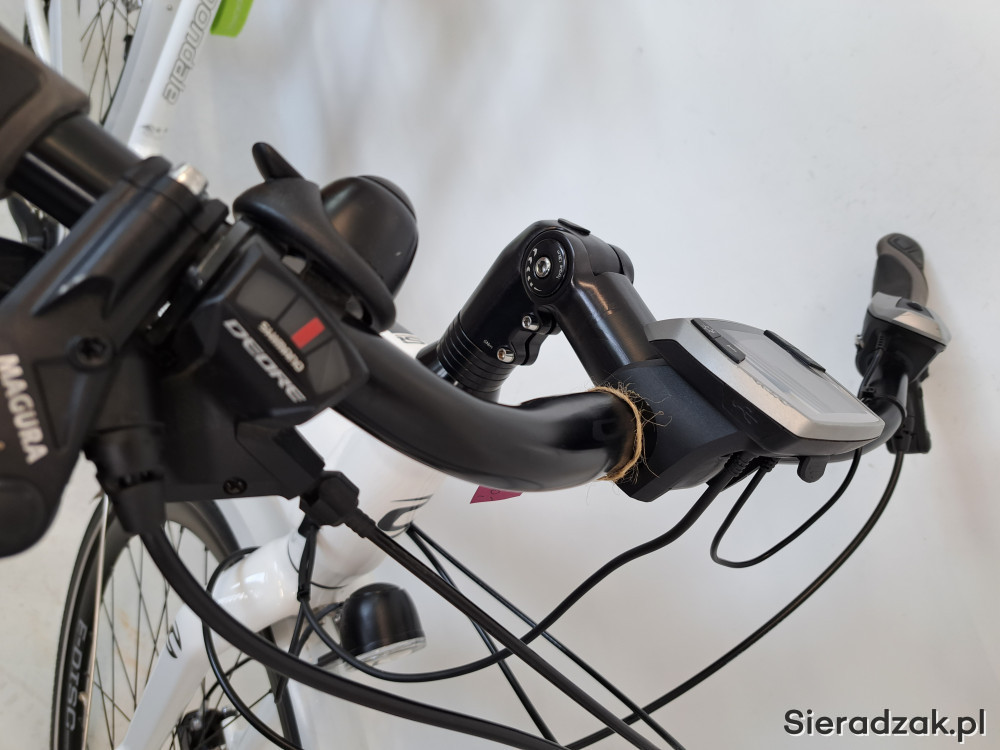 rama aluminium 22" 55cm,napęd 9-rzędowy,przerzutka shimano deore,manetka shimano deore,hamulce hydrauliczne magura mt2,oświetlenie zasilane z akumulatora,zabezpieczenie tylnego koła axa,widelec fatty,siodełko selle royal ariel,mostek regulowany,opony schwalbe gt tour