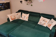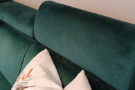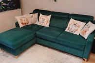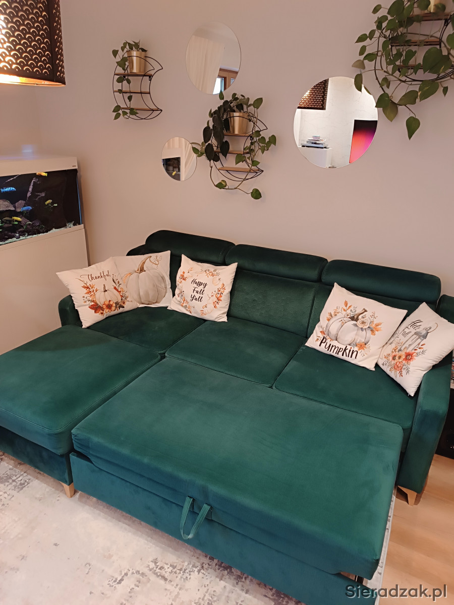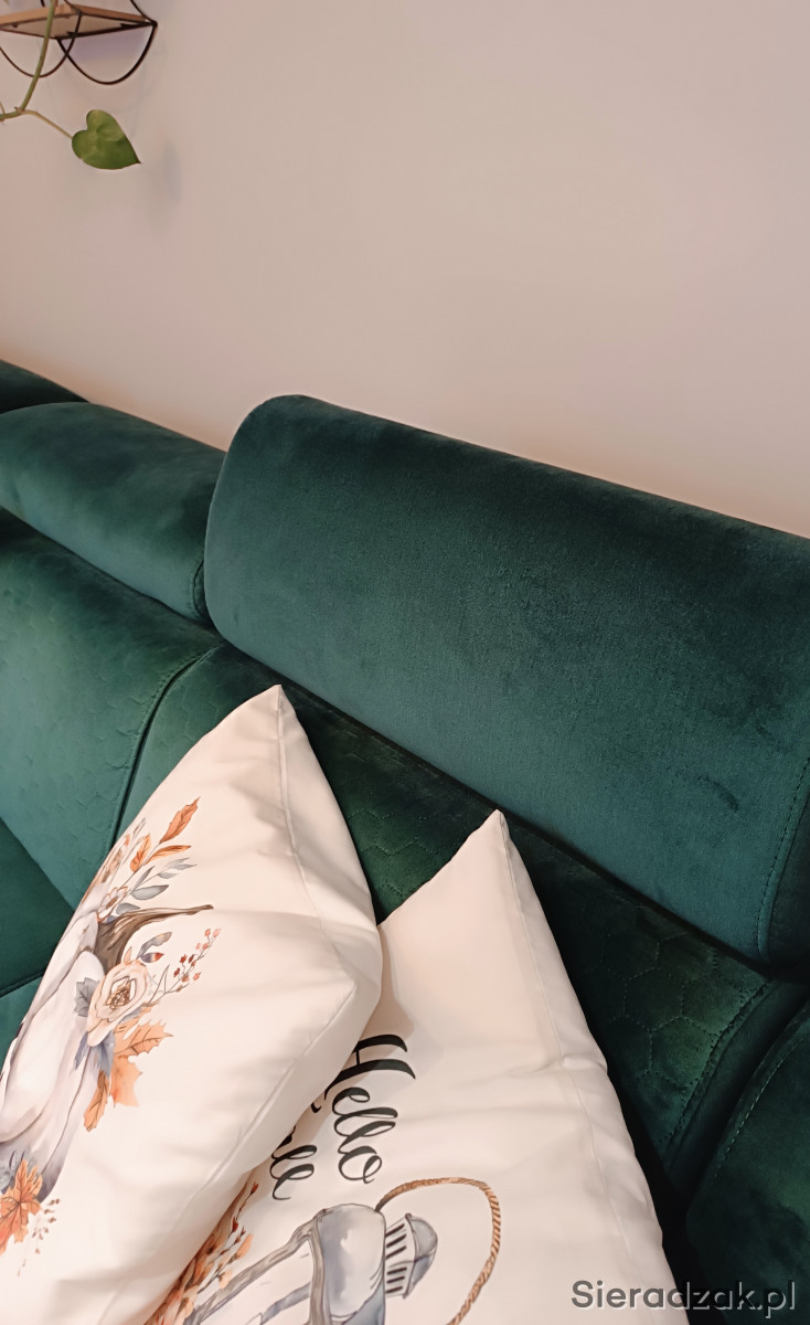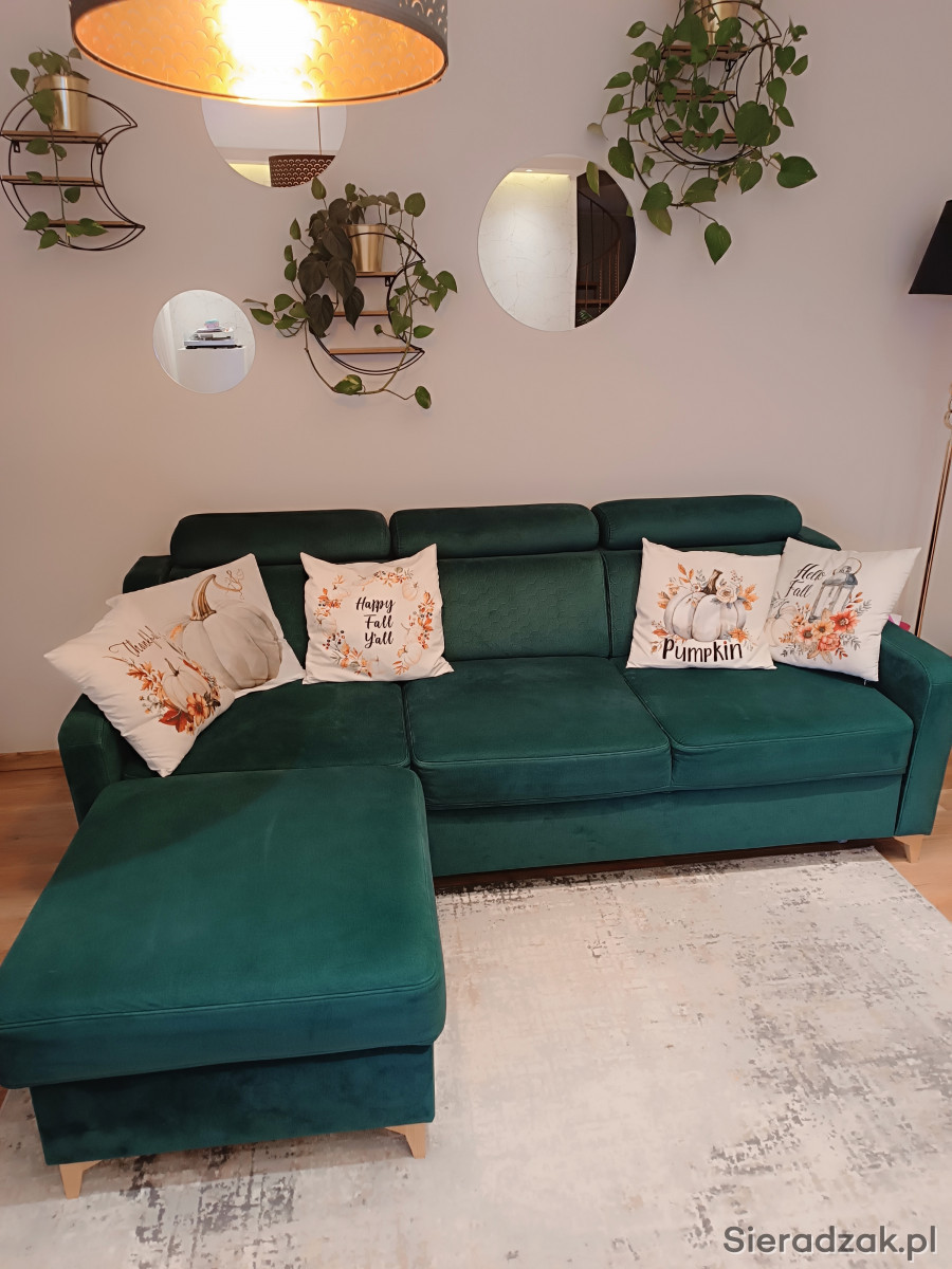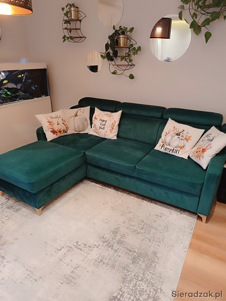 Sprzedam nowczesny, w kolorze butelkowej zieleni narożnik na nóżkach w kształcie litery L. Mebel pasuje do nowoczesnego wnętrza, a jego kolor i design nadają mu unikalny charakter. Narożnik pokryty jest tkaniną welur velvet. Tkanina miękka, lśniącą i nadaje wnętrzu luksusowy wygląd. Dodatkowo zabezpieczona jest chemicznie przed przyjmowaniem płynów, kurzu oraz brudu. Wymiary: 223 cm długość x 172 cm leżanka x 96 cm krótszy bok, wysokość boku w najniższym punkcie 60 cm, w najwyższym 76 cm, z podniesionymi zagłówkami 105 cm. Posiada 3 regulowane zagłówki oraz pojemnik na pościel. Można ją rozłożyć. Część rozłożona również pokryta taką samą tkaniną jak cały narożnik. Mebel jest w stanie idealnym. Nie posiada żadnych plam, zabrudzeń, przetarć, dziur. Wyglada jak nowy. Cena nowego narożnika to 4400 zł + cena za materiał. Sprzedaję za 2500 zł. Cena do lekkiej negocjacji.