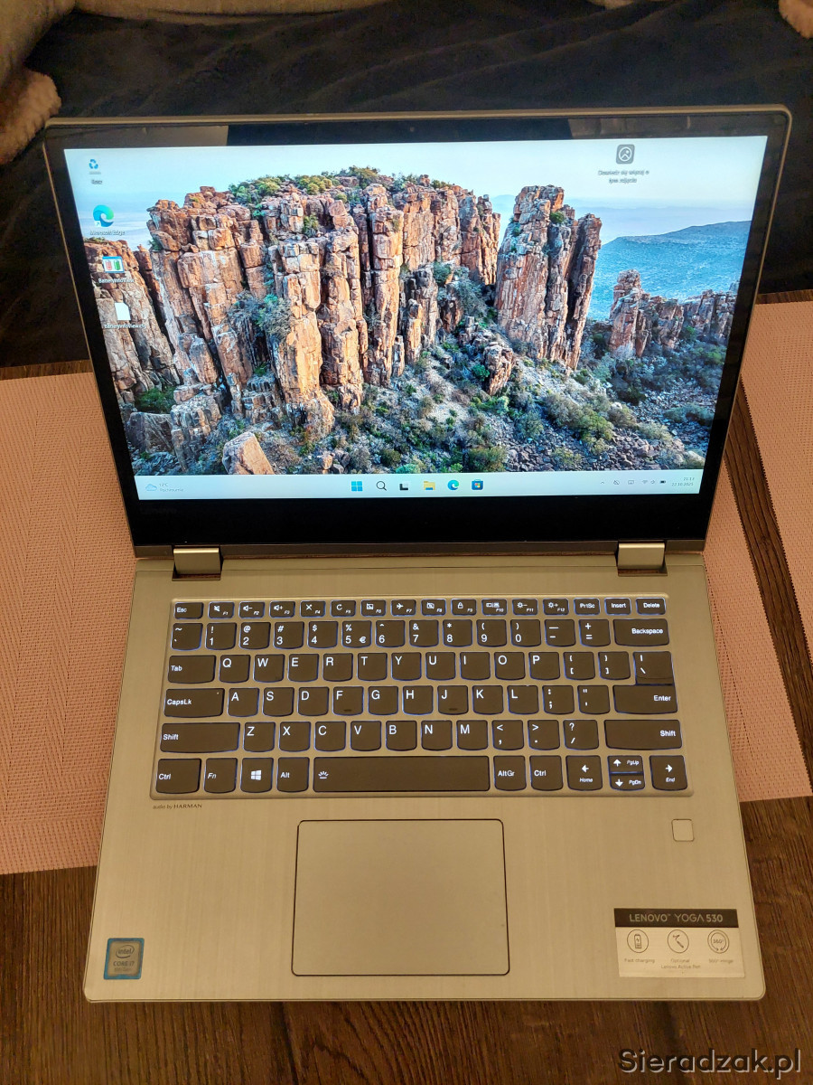 Na sprzedaż posiadam laptopa 14 cali Lenovo Yoga 530 360 stopni, jest to laptop typu 2 w 1, ponieważ posiada dotykowy ekran obsługiwany palcem jak w telefonie a ten ekran możemy jeszcze złożyć na płasko tak że robi nam się z laptopa tablet.