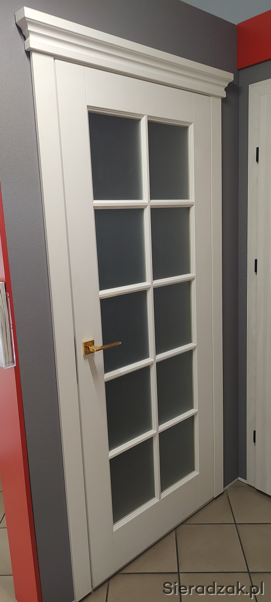 Sprzedam prawe drzwi wewnętrzne bezprzylgowe z koroną w kolorze białym RAL 9003 malowanym w rozmiarze skrzydła 80 ze szkleniem matowym białym, ościeżnicą regulowaną 9,5 – 12 cm i opaską 8 cm.