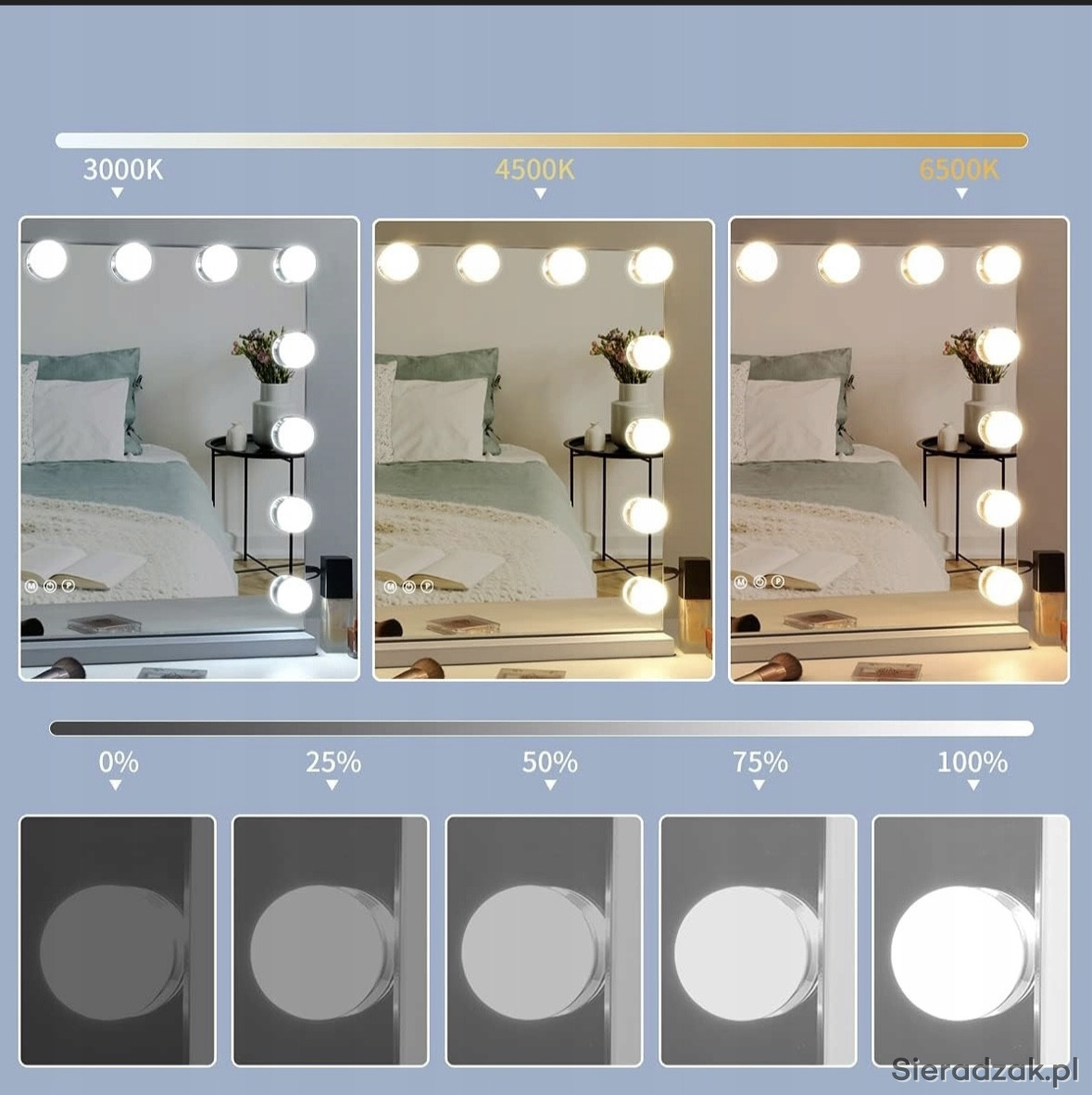 Lustro wyposażone jest w 15 regulowanych diod LED, które oferują trzy różne temperatury barwowe: zimne, ciepłe i naturalne światło. Dzięki możliwości regulacji jasności (0%, 25%, 50%, 70%) możesz dostosować oświetlenie do swoich potrzeb i preferencji.