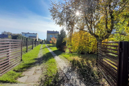 Dookoła zabudowa mieszkaniowa jednorodzinna w pobliżu, szkoła podstawowa, przedszkole, sklepy (Dino), kościół.