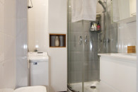 W pierwszej sypialni pojemna szafa w zabudowie typu komandor, łóżko sypialniane wraz ze stolikami nocnymi, półki i telewizor.