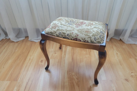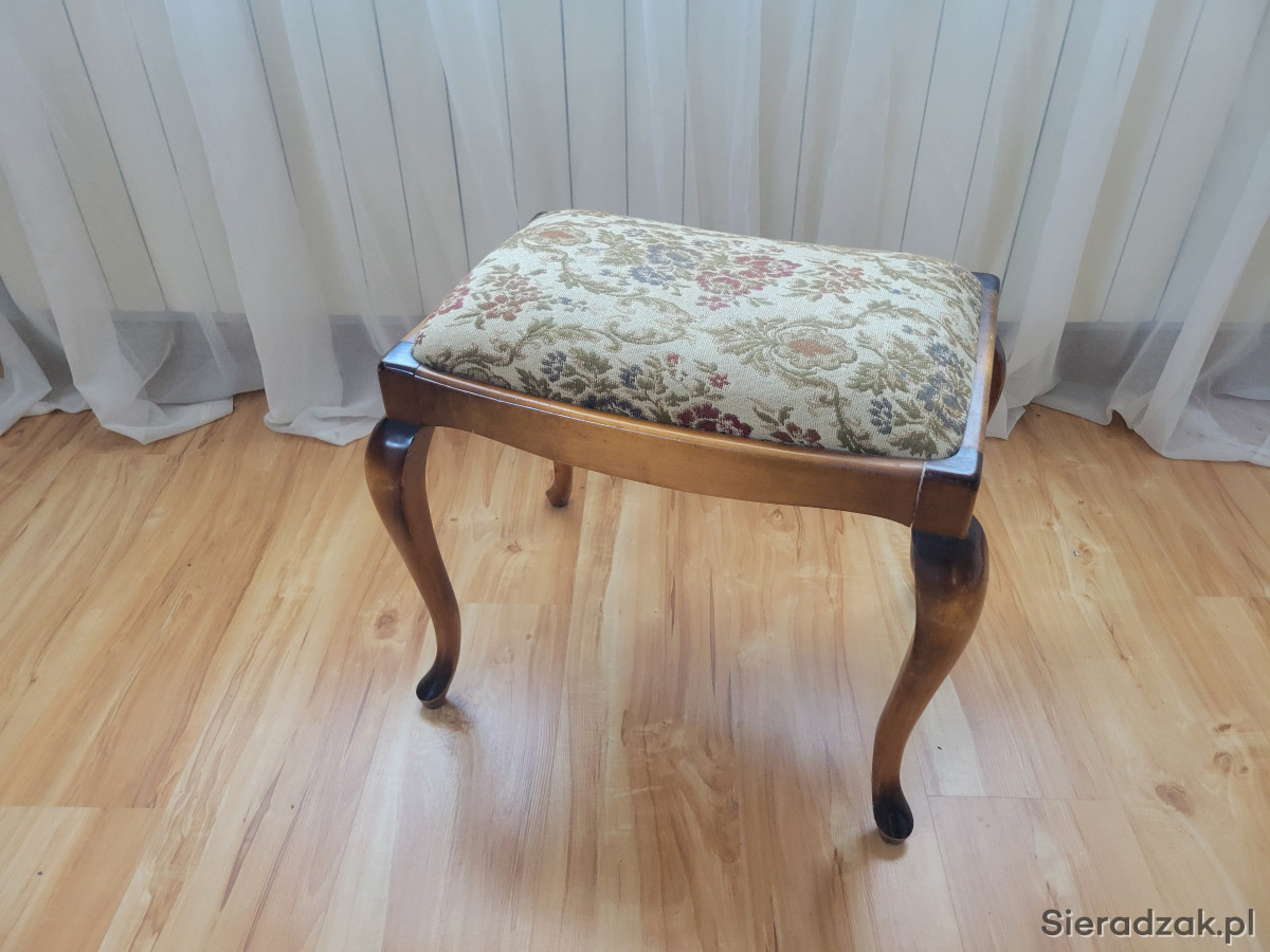 Elegancki, drewniany stołek z tapicerowanym siedziskiem w kwiatowy wzór.