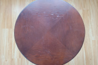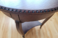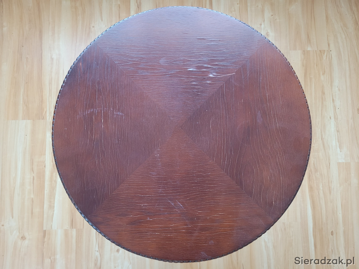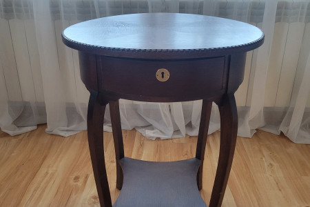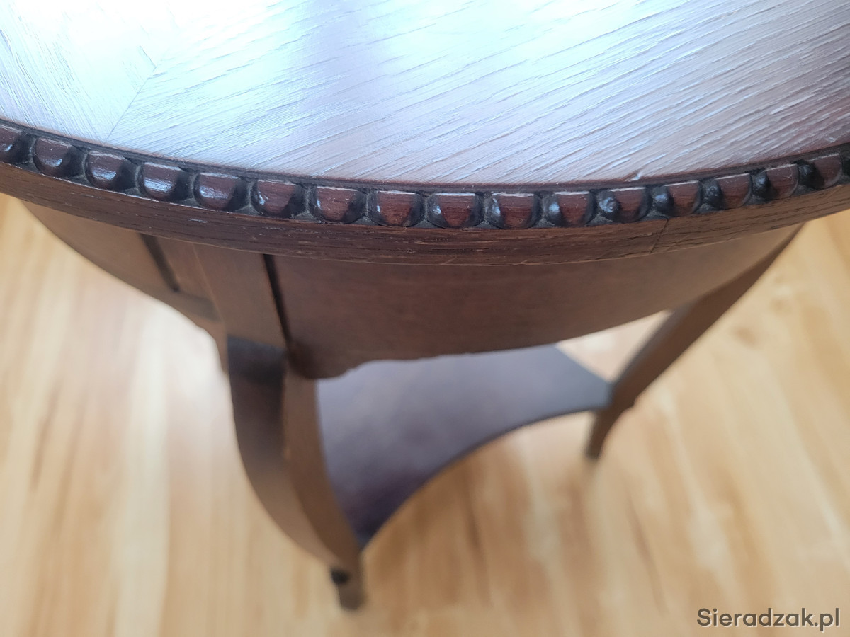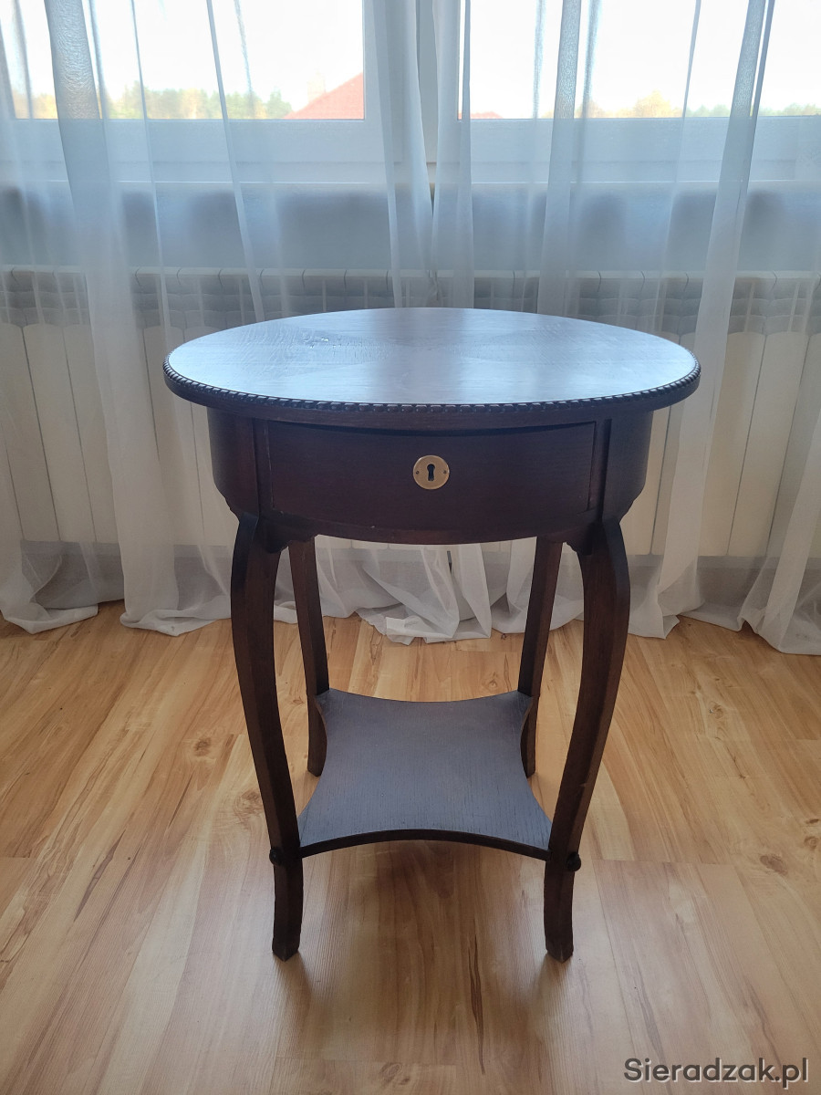Okrągły, drewniany stolik na giętych nogach, z małą szufladą i dolną półką. W dobrym stanie, idealny jako stolik pomocniczy lub nocny.