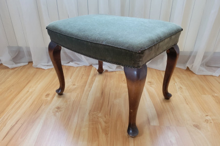 Elegancki, drewniany stołek z zielonym tapicerowanym siedziskiem.