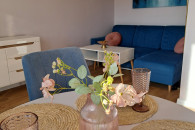 jasnego i przytulnego salonu z wyjściem na duży balkon, wyposażonego w nastrojowe oświetlenie LED sterowane pilotem,
