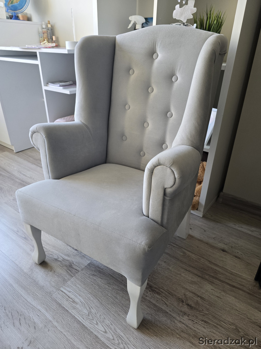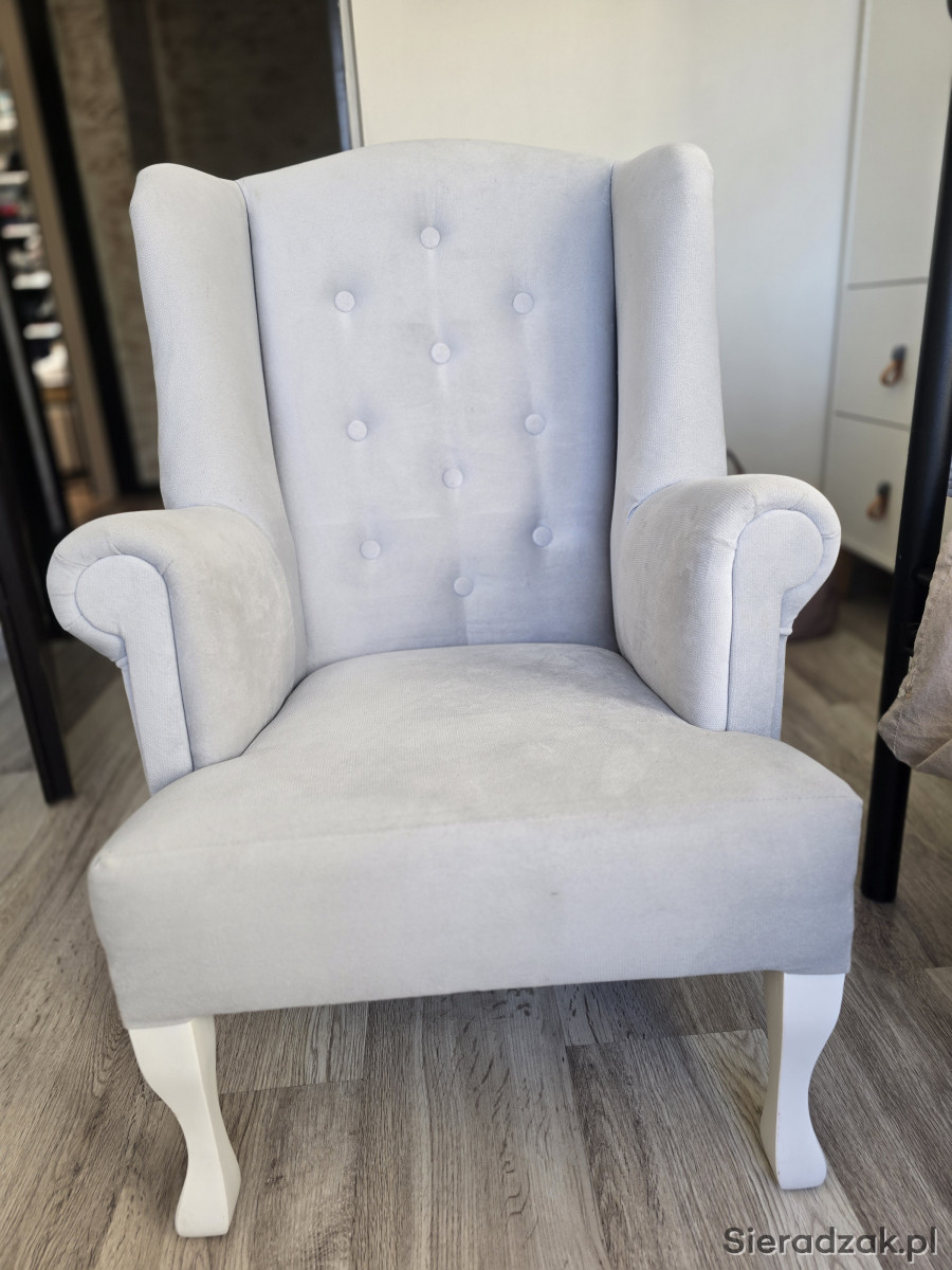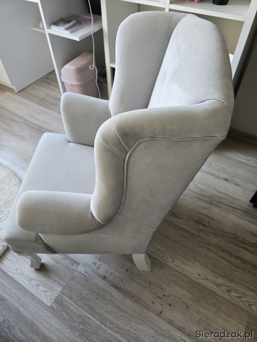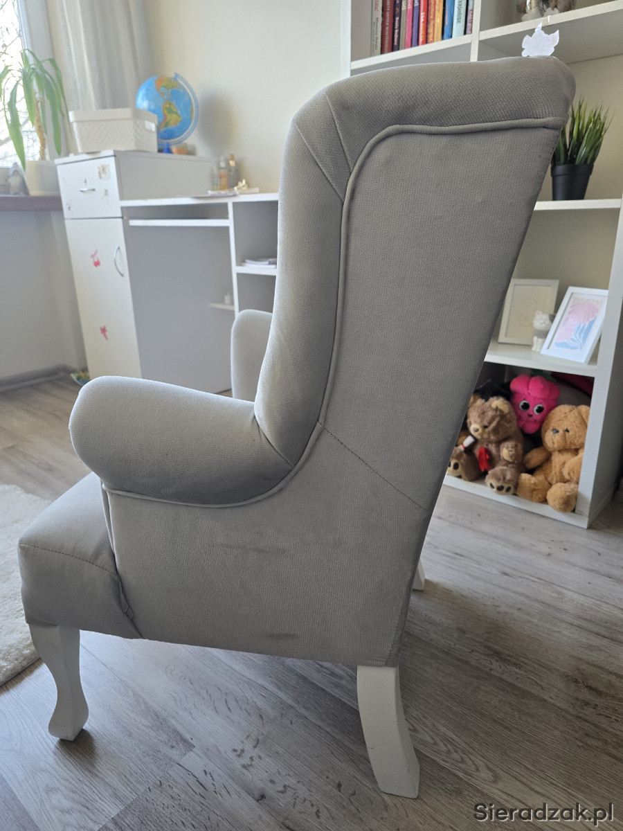 Sprzedam fotel uszak w bardzo dobrym stanie,do pokoju małej księżniczki, kolor szary, bardzo milutki materiał. Wymiary wysokość całkowita 83 cm, szerokość całkowita 53cm, wysokość do podłokietnika 53cm, głębokość siedziska 42cm. Serdecznie polecam.