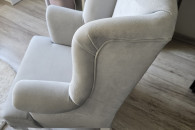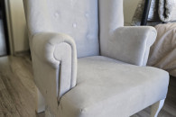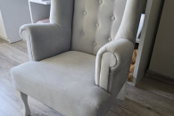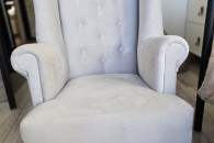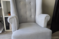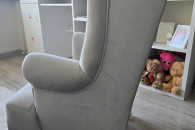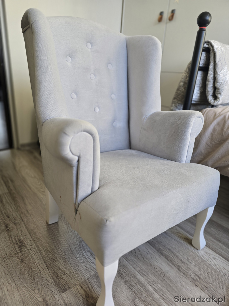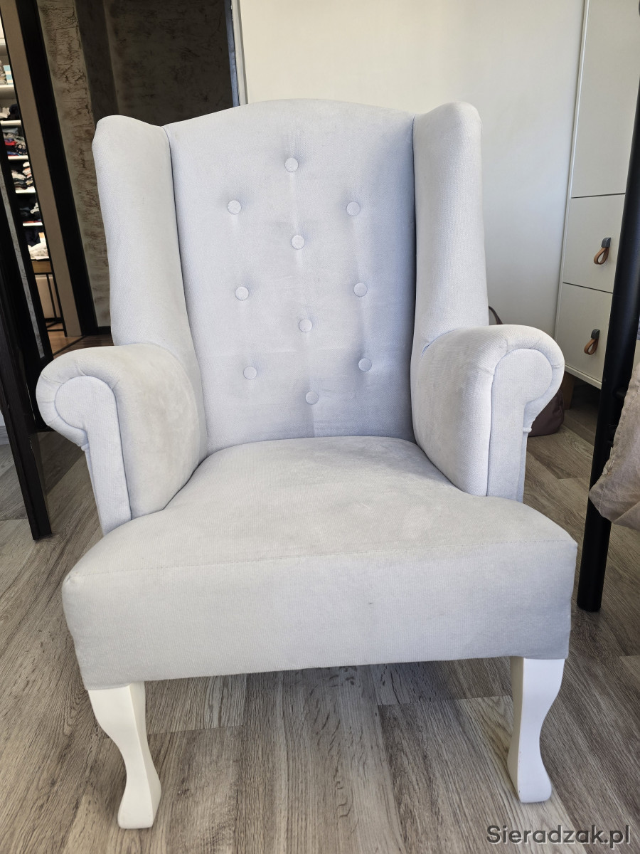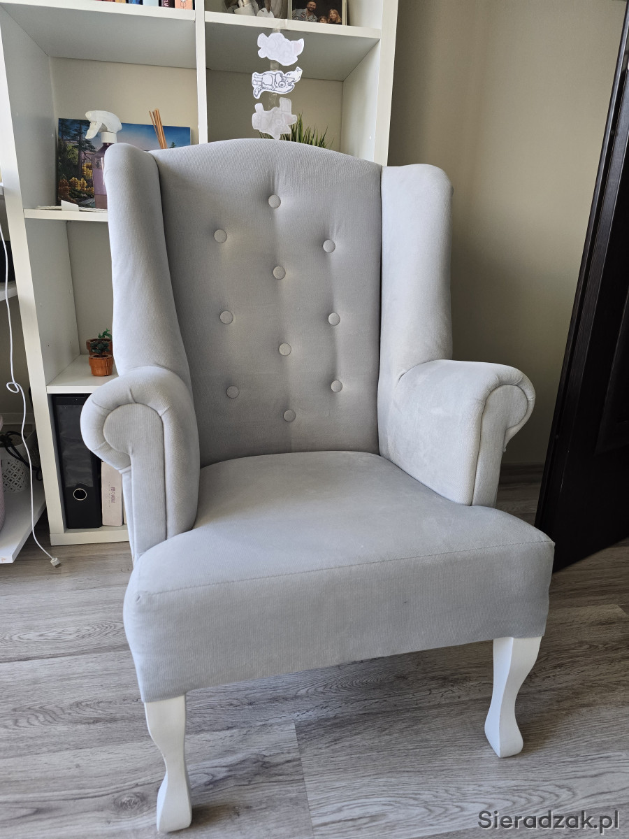 Sprzedam fotel uszak w bardzo dobrym stanie,do pokoju małej księżniczki, kolor szary, bardzo milutki materiał. Wymiary wysokość całkowita 83 cm, szerokość całkowita 53cm, wysokość do podłokietnika 53cm, głębokość siedziska 42cm. Serdecznie polecam.
