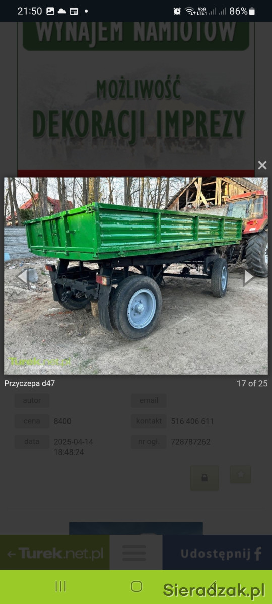 Sprzedam przyczepę rolnicze wywrotka na 3 strony, d47,zarejestrowana, opłacony.oc przegląd, więcej informacji pod numerem telefonu 516 406 611.