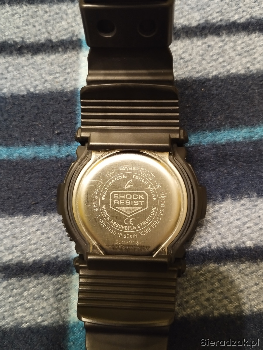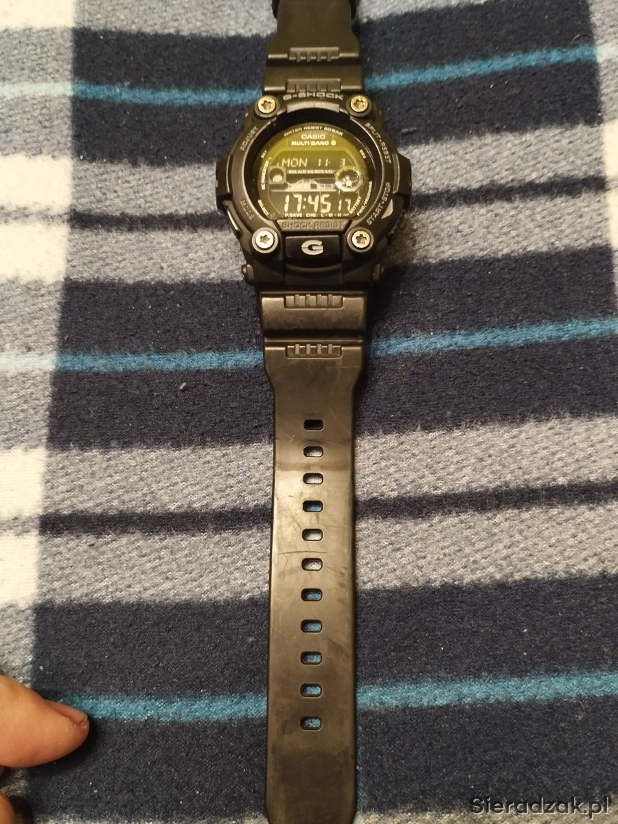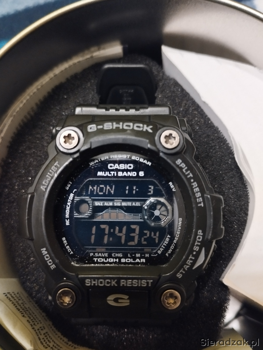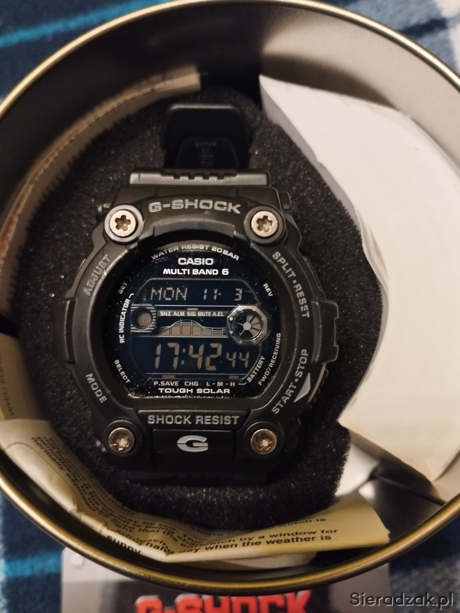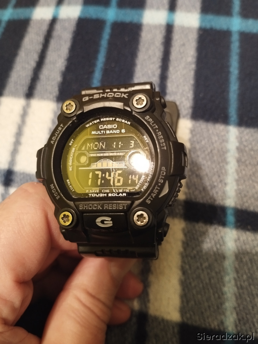 Zegarek męski używany Casio G SHOCK GW-7900B-1ER w kolorze czarnym, jeden z najlepszych i najwytrzymalszych G-shocków. Bateria słoneczna, pływy morskie, fazy księżyca, Multi Band 6, strefy czasowe, podświetlanie tzw. iluminator itd. Stan jak na zdjęciach, szkiełko posiada jedną rysę w kształcie litery L i kilka mikrorys widocznych tylko pod odpowiednim kątem nie przszkadzają w normalnym użytkowaniu, wszystkie funkcje działają prawidłowo, łączy się co noc z zegarem atomowym. Rok produkcji wg nr seryjnego to 2019r. Na sprzedaż wszystko co na zdjęciu.
