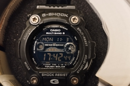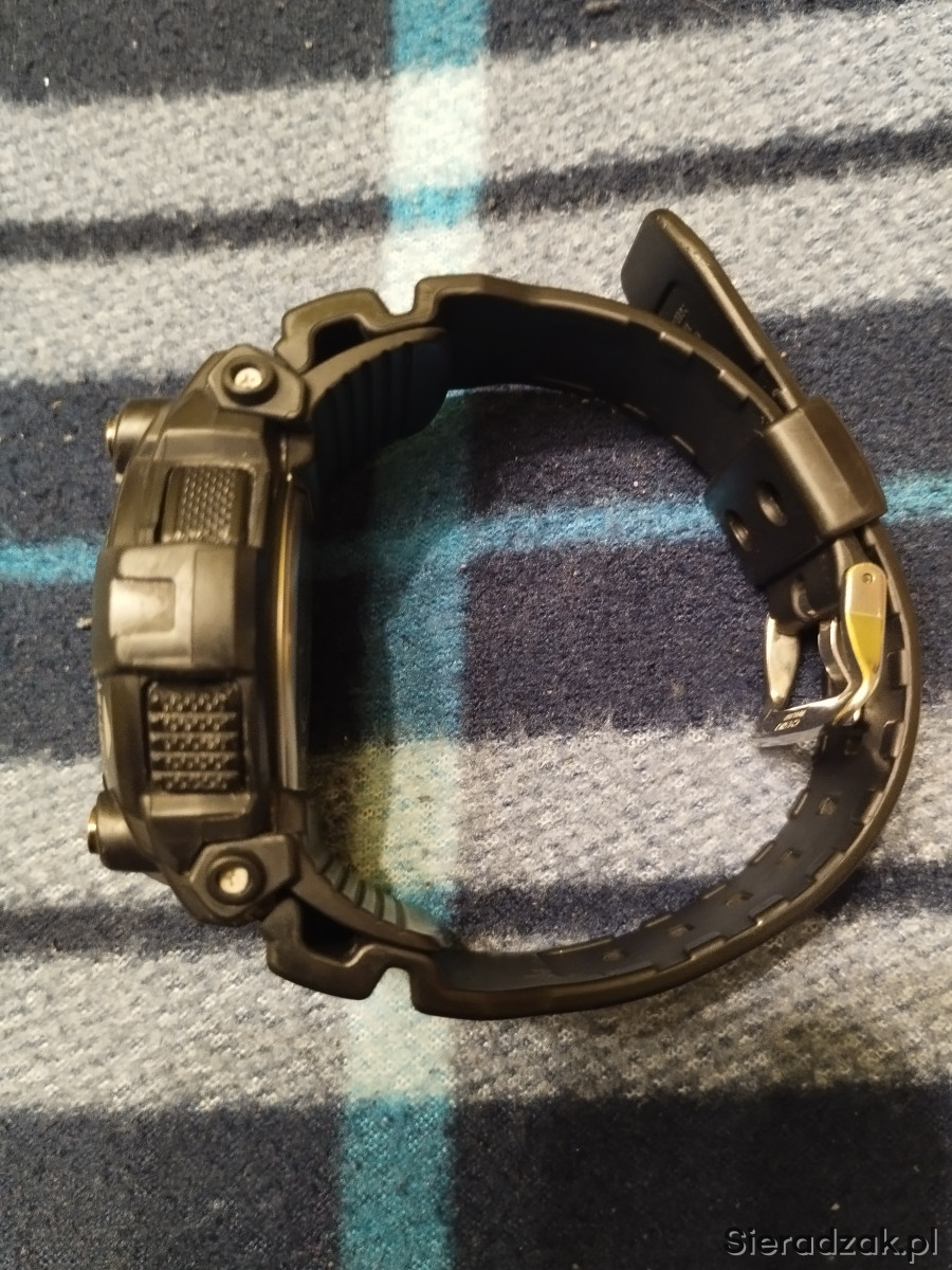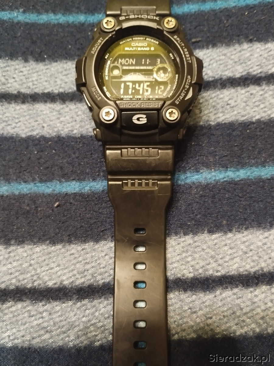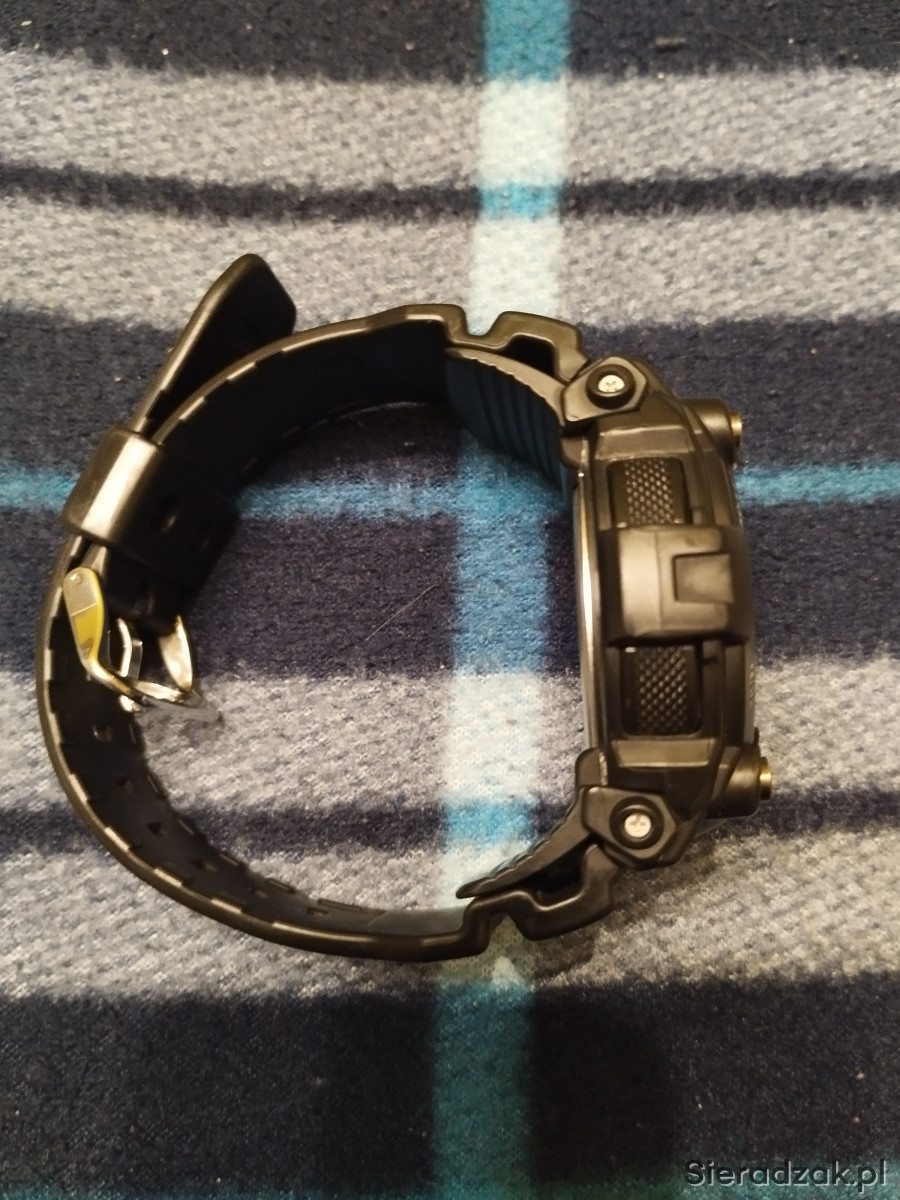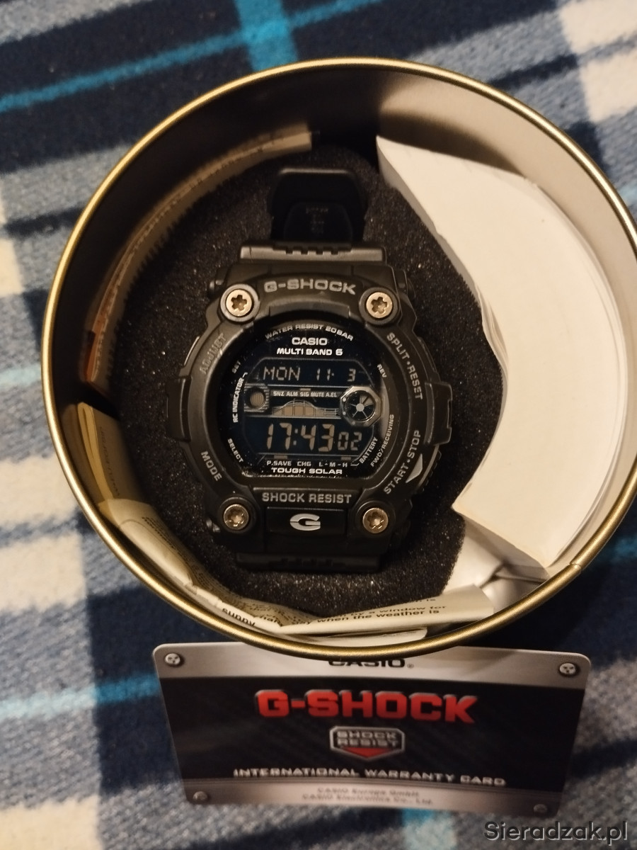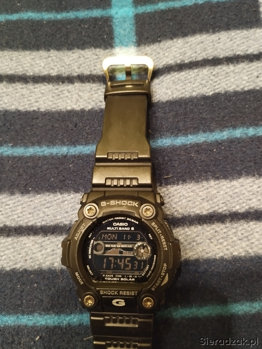 Zegarek męski używany Casio G SHOCK GW-7900B-1ER w kolorze czarnym, jeden z najlepszych i najwytrzymalszych G-shocków. Bateria słoneczna, pływy morskie, fazy księżyca, Multi Band 6, strefy czasowe, podświetlanie tzw. iluminator itd. Stan jak na zdjęciach, szkiełko posiada jedną rysę w kształcie litery L i kilka mikrorys widocznych tylko pod odpowiednim kątem nie przszkadzają w normalnym użytkowaniu, wszystkie funkcje działają prawidłowo, łączy się co noc z zegarem atomowym. Rok produkcji wg nr seryjnego to 2019r. Na sprzedaż wszystko co na zdjęciu.