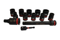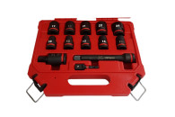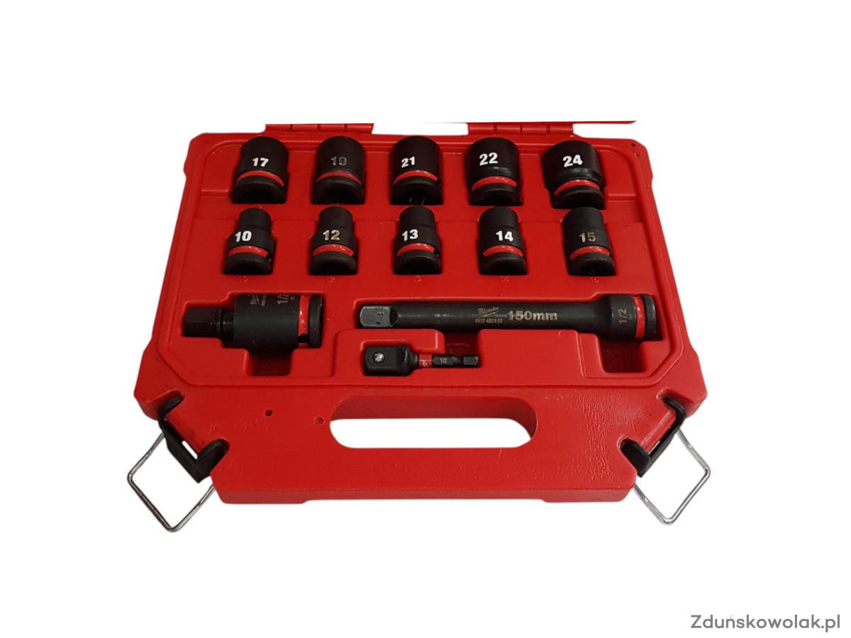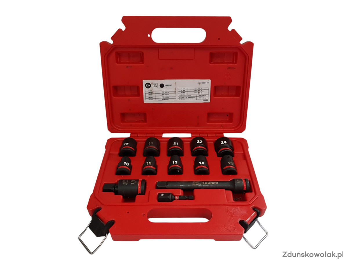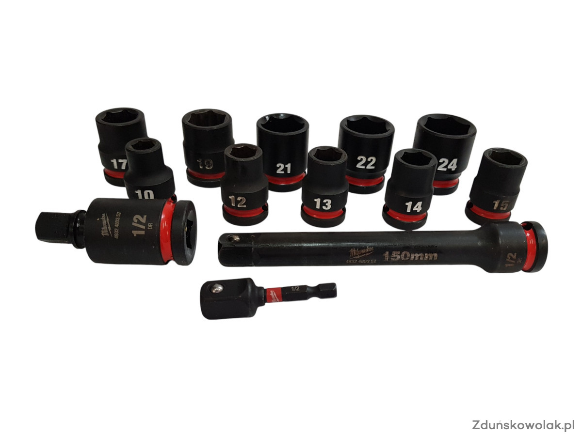 10 nasadek udarowych o rozmiarach: 10 mm, 12 mm, 13 mm, 14 mm, 15 mm, 17 mm, 19 mm, 21 mm, 22 mm, 24 mm