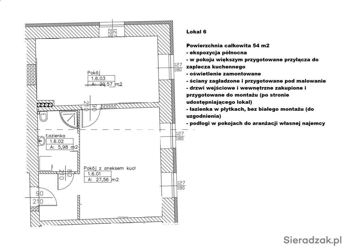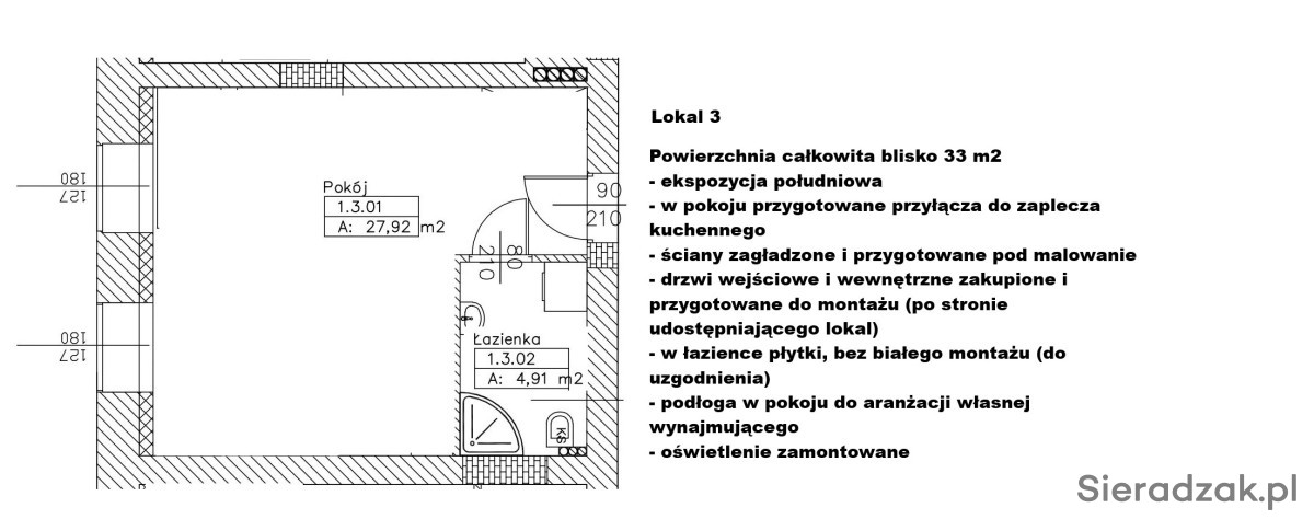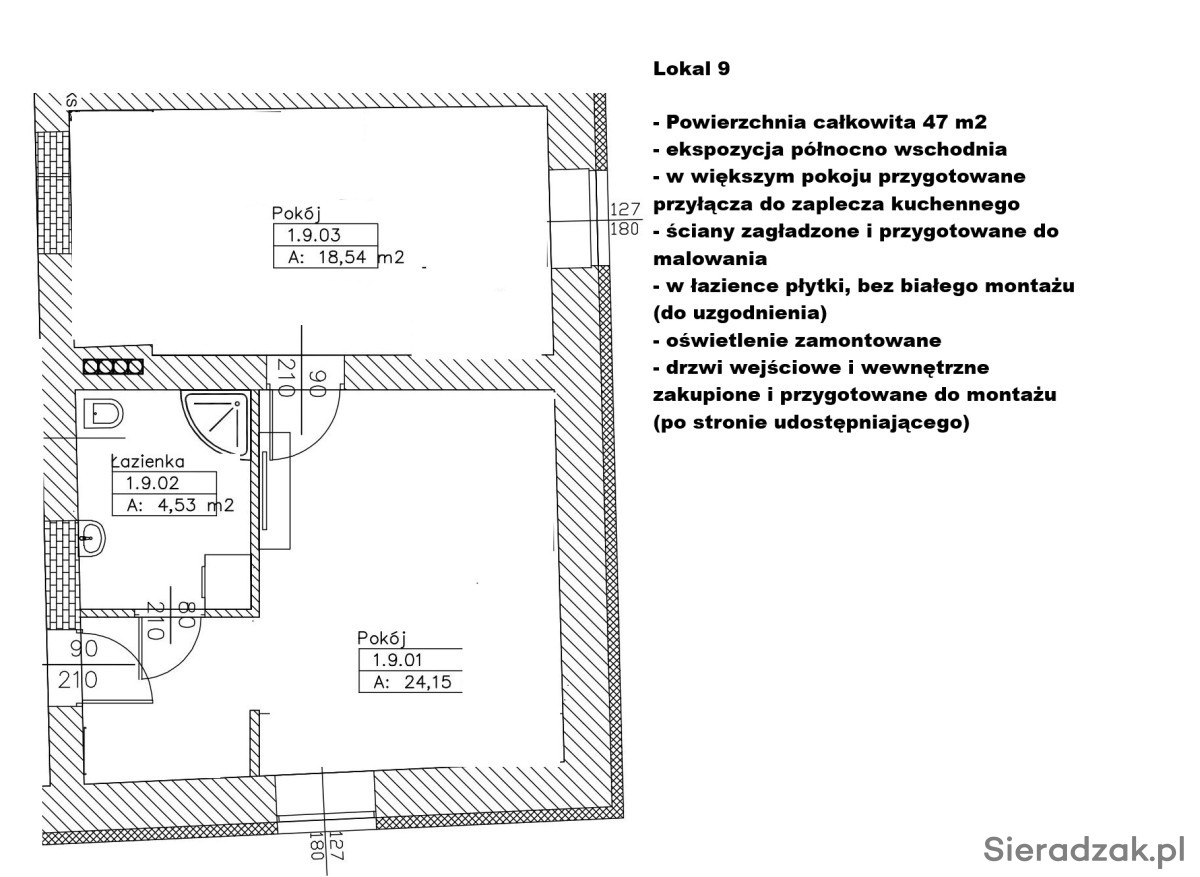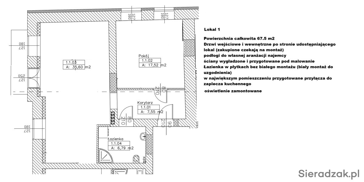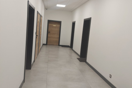 Lokale wykończone - do pomalowania, ewentualnie własnej aranżacji. W każdym lokalu łazienka (glazura terakota już położone wszędzie, w łazienkach brak białego montażu) w każdym lokalu przygotowane przyłącza do zaplecza np. kuchennego, w każdym zamontowane oświetlenie, dodatkowo przestronny szeroki korytarz o powierzchni ponad 60 m2 wraz z 1 ogólnodostępną z korytarza łazienką. Lokale idealne np. na gabinety lekarskie, biura, czy na działalność beauty.