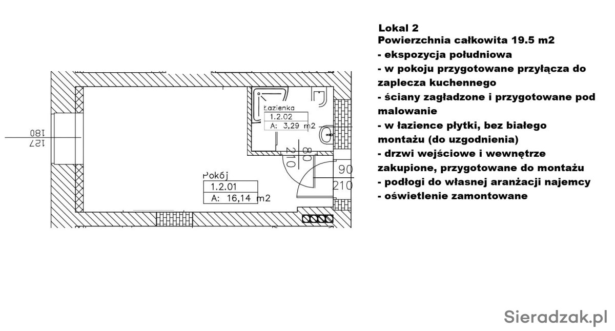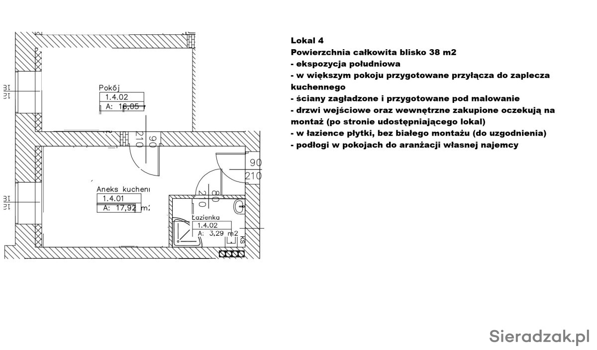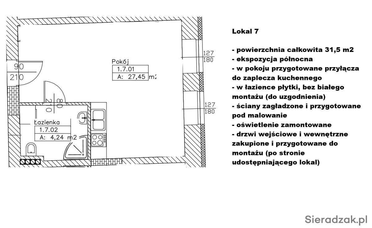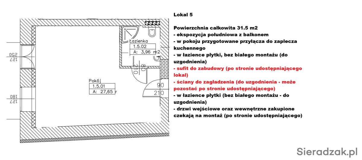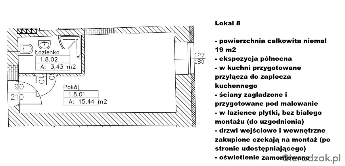 Lokale wykończone - do pomalowania, ewentualnie własnej aranżacji. W każdym lokalu łazienka (glazura terakota już położone wszędzie, w łazienkach brak białego montażu) w każdym lokalu przygotowane przyłącza do zaplecza np. kuchennego, w każdym zamontowane oświetlenie, dodatkowo przestronny szeroki korytarz o powierzchni ponad 60 m2 wraz z 1 ogólnodostępną z korytarza łazienką. Lokale idealne np. na gabinety lekarskie, biura, czy na działalność beauty.
