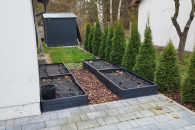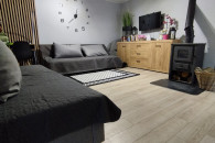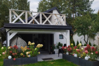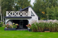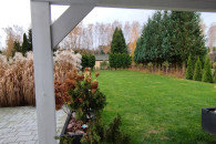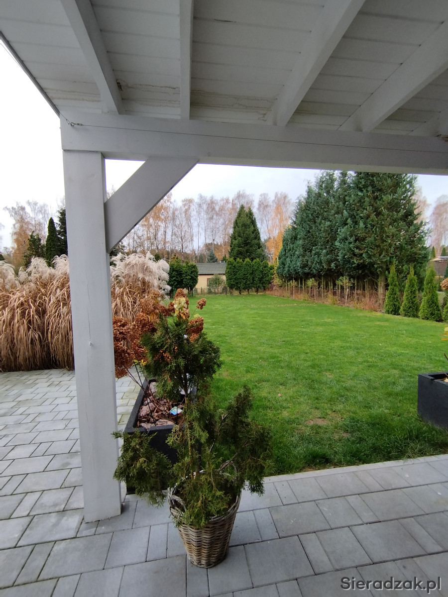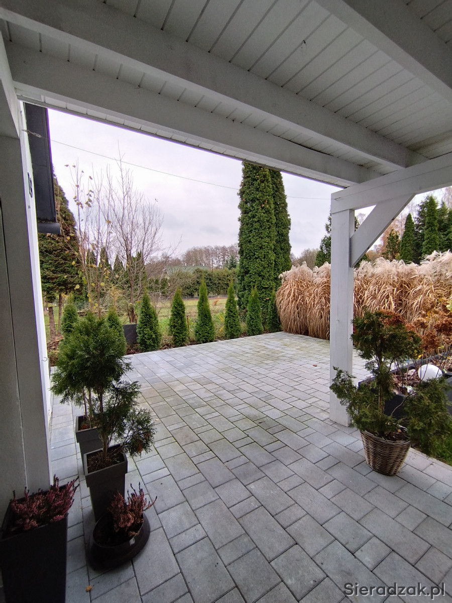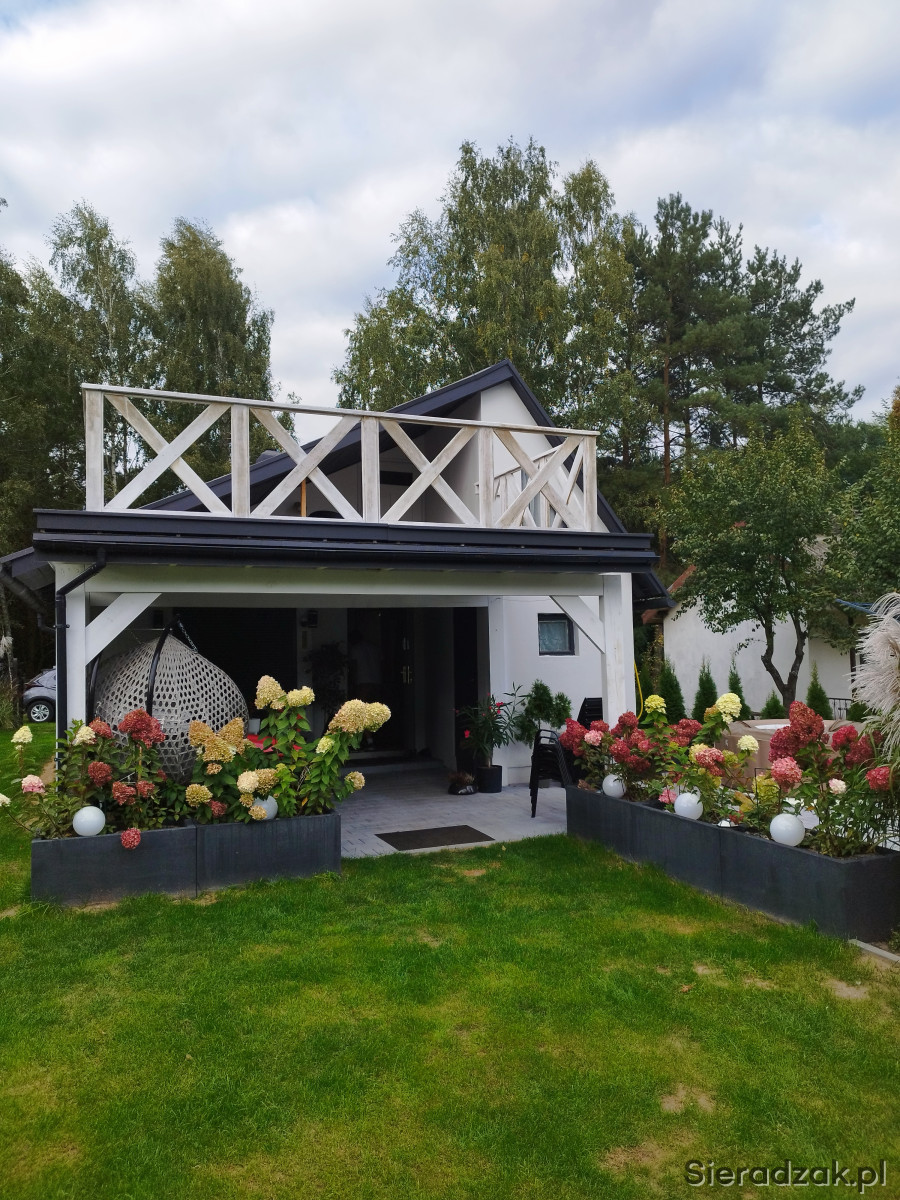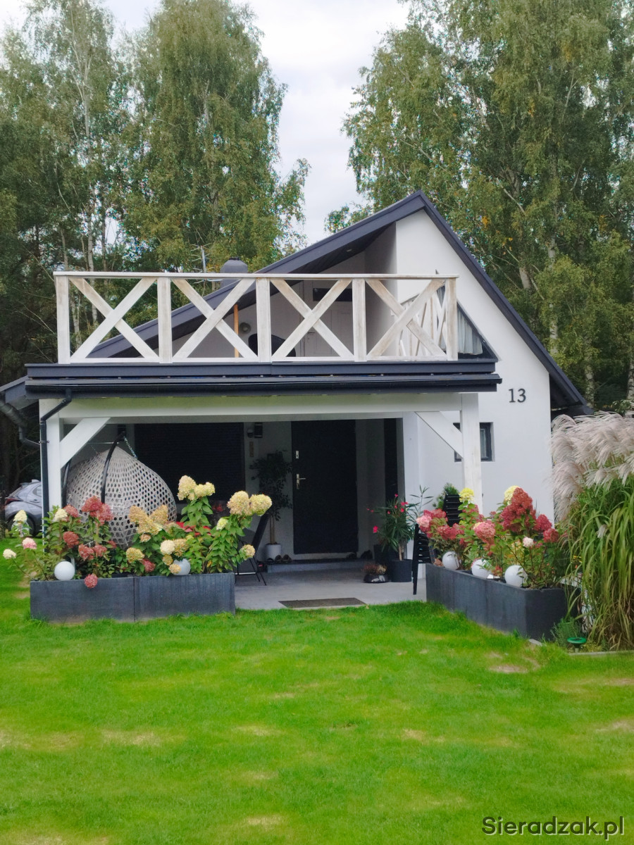 Cicha i zielona okolica – z tyłu domku las i duży plac do parkowania samochodu